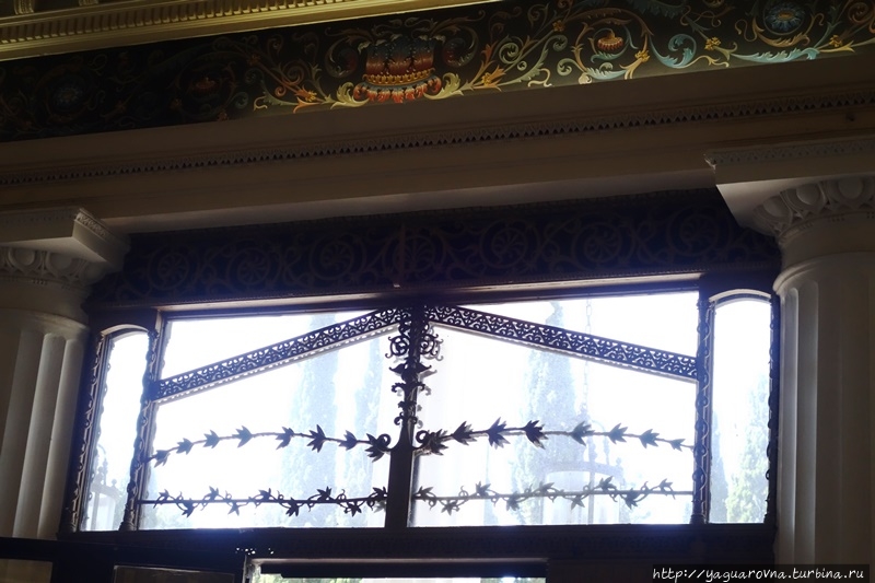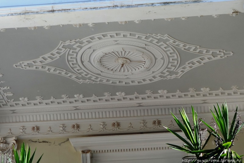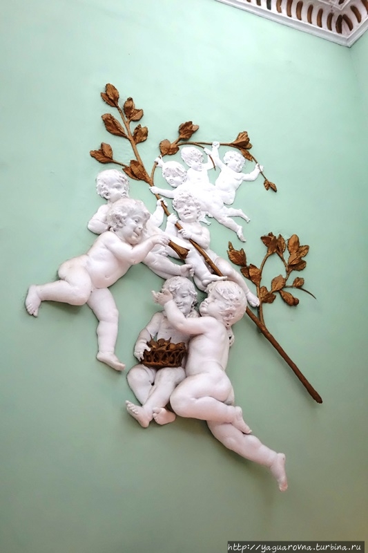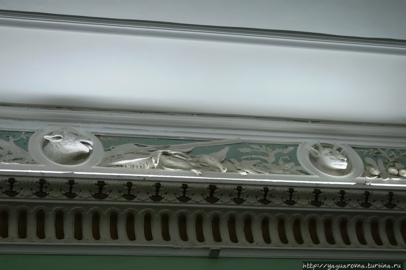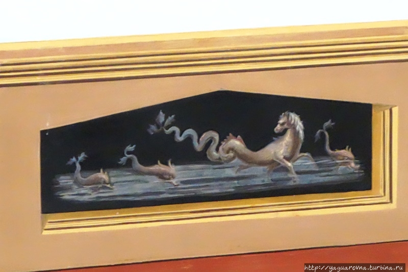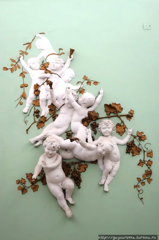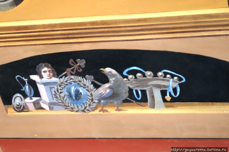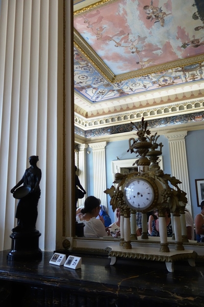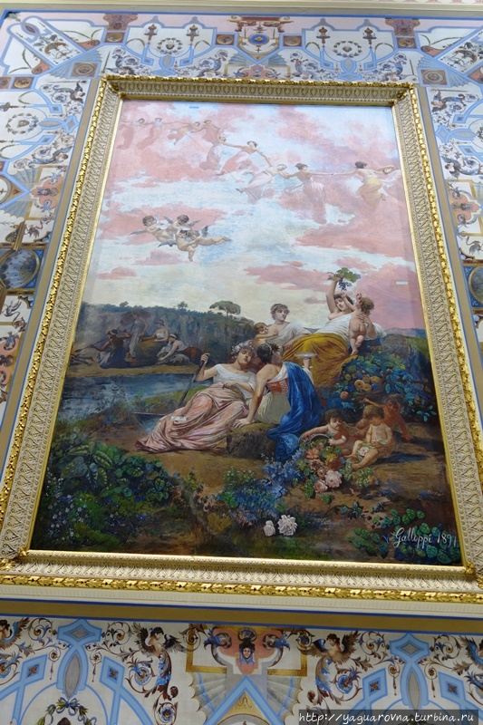 Подняв глаза, их уже трудно отвести от росписного потолка работы итальянского художника Галлопи. Изображения символизируют 4 времени года и богинь времени и времен года — Орес, трех дочерей Зевса и Фемиды. .