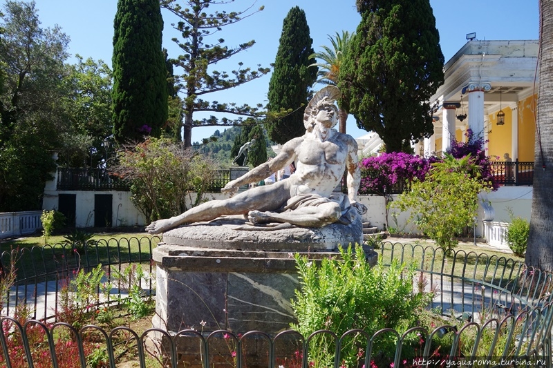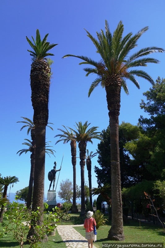 Здесь достаточно много скульптур, но 2 из них затмевают остальные. Это изображения Ахилла. Первый вариант выполнен Гетчем из латуни — Ахилл в полный рост, с поднятым копьем, на высоком постаменте на краю вершины, обращенный к морю, он молод, красив, силен — и любим императрицей Сиси.
