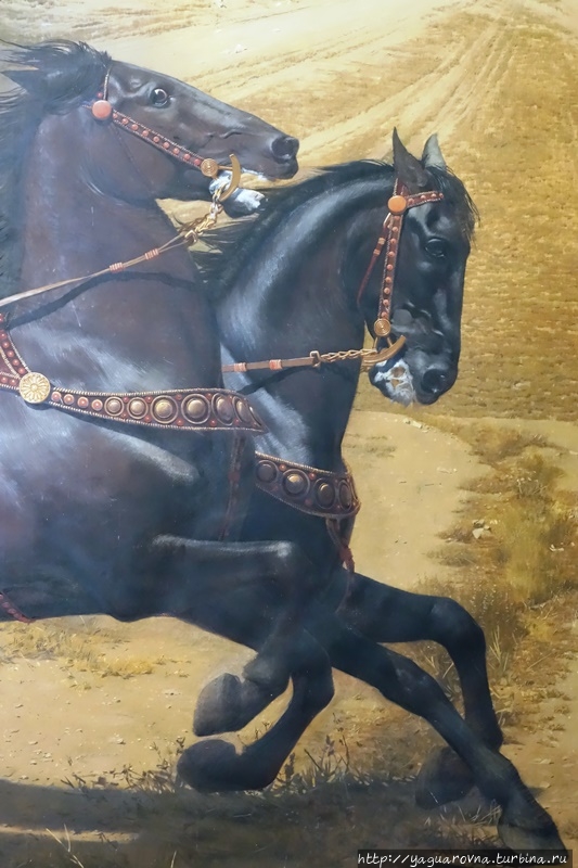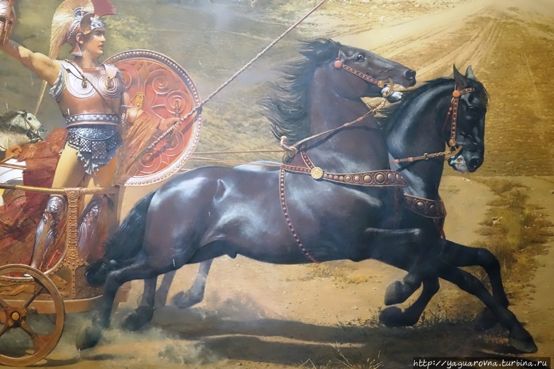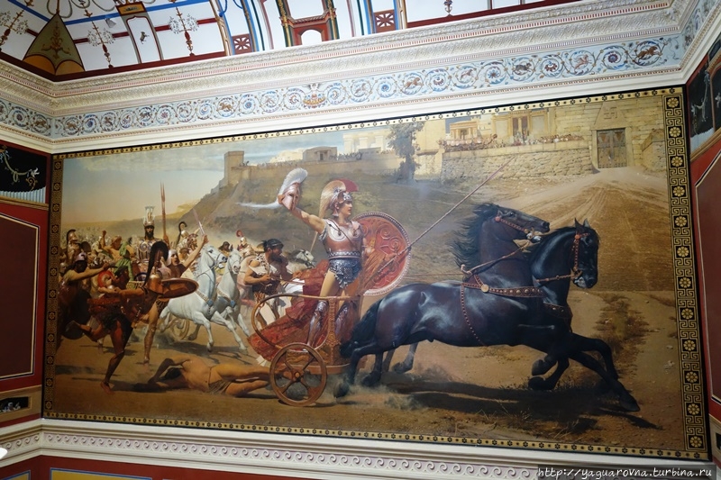 А во всю стену под потолком впечатляющая картина австрийского художника Франца фон Мача «Триумф Ахилла», выполненная по заказу Сиси. На полотне размером 4х10 метров Ахилл мчит на колеснице, зацепившей колесом тело побежденного им Гектора. . Помню, что нам рассказали, будто бы при представлении картины публике кто-то высказал мнение, что изображение не динамично, скорость колесницы не передана. Это якобы так огорчило автора, что тот покончил с собой.