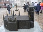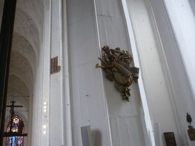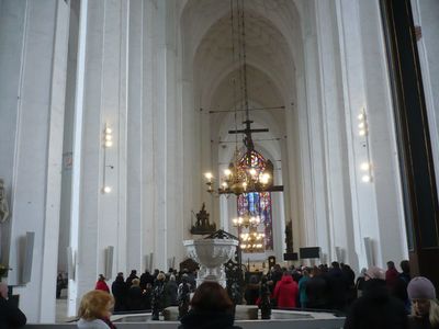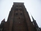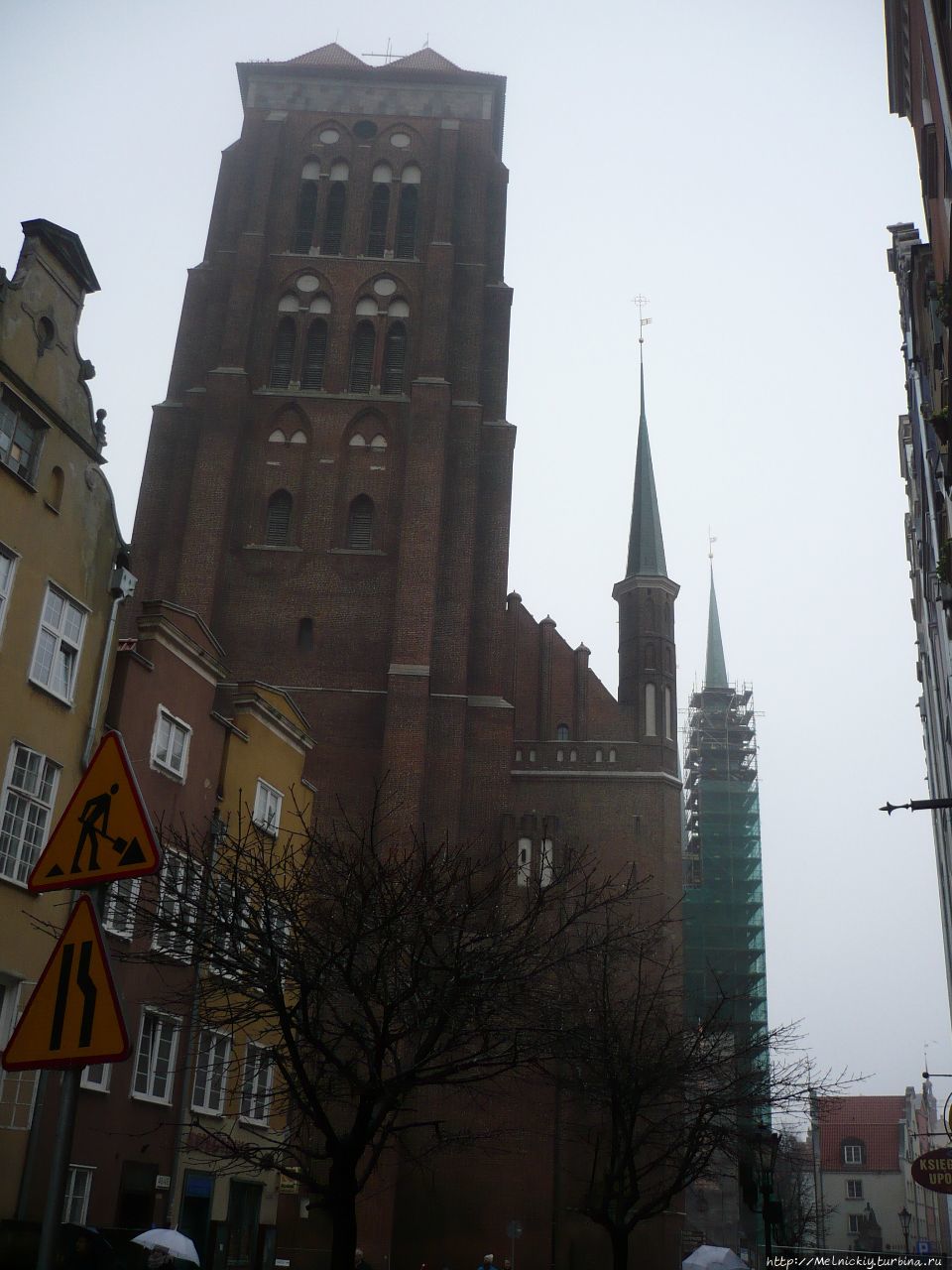 Крупнейшая в Европе кирпичная церковь святой Девы Марии находится в самом центре Старого города Гданьска. Строили ее почти 150 лет и закончили в 1502 году. До 1945 года это была крупнейшая лютеранская церковь в мире. Длина церкви составляет 105 метров, высота свода над полом 29 метров. На 77-ти метровую колокольню ведет четырехсот ступенчатая лестница. С колокольни открывается великолепная панорама города, но мы не полезли наверх из-за плохой и дождливой погоды. Над городом висели низкие тучевые облака.
