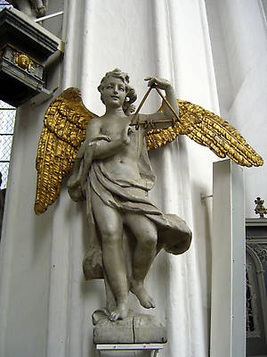 Очень рекомендую зайти в костел и осмотреть его. Вход, правда, платный – 4 злотых (это около 1 евро). Внутри костел белого цвета, а своды кажутся невероятно высокими. Здесь можно увидеть довольно ценные экспонаты: астрономические часы XV века (автор Ханс Дюрунгер); скульптуру Гданьской Мадонны также XV в.; готическую дарохранительницу и другие. Обязательно осмотрите прекрасные витражи, настенные росписи и многочисленные скульптуры. Мне очень приглянулись скульптуры, изображающие ангелов, играющих на различных музыкальных инструментах.