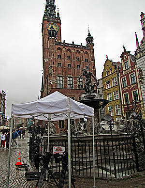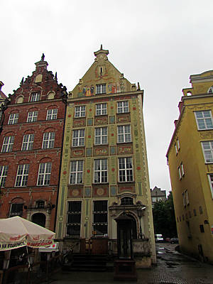 Это, как все видят, не просто ворота, а строение в стиле маньеризма. Ворота были построены в 1568-1571 годы Регнером из Амстердама и Гансом Крамером из Дрездена, и предназначались для резиденции монархов, посещающих город. Далее, аж до городской Ратуши проходит широкая часть Тракта — Długi Targ, название которого можно перевсти, как "длинный рынок". Старые узкие домики с расписными фасадами по обе стороны. Рестораны, сувенирные магазаны — привычные атрибуты исторических центров популярных туристических городов...