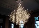 А ещё у них нашлась целая столовая, совершенно невероятно оформленная. Особенно впечатлили массивный стол, сделанный из "книжных стопок" и огромная люстра из нагромождения тончайших светящихся трубочек.