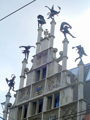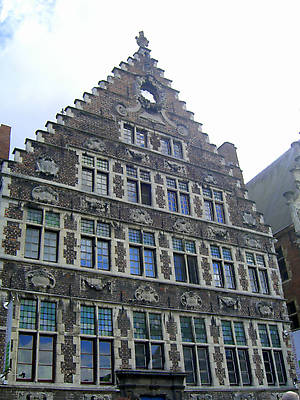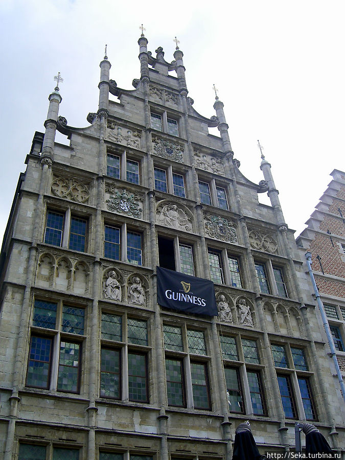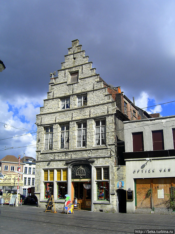 Через ворота можно пройти, так вы окажетесь на набережной. Прямо перед вами будет Большой мясной дом, а справа откроется вид на церковь Святого архангела Михаила. Пройдя по мосту через реку мы выходим к еще одному интересно украшенному дому по улице Burgstraat. Это так называемый "Дом коронованных особ". На его фасаде можно увидеть портреты 14 графов Фландрии. Улица Jan Breydelstraat выводит к очередному мосту через реку. С него открывается прекрасная панорама на Граслей (Graslei) и Коренлей (Korenlei). Название первой переводится как улица трав, второй — зерновая. Вдоль этих улиц стоят дома с красивейшими фасадами, выполненным в различных стилях — романском, барокко, ренессанс. А мы уже совсем рядом с церковью Святого архангела Михаила. Обращаю внимание, что у этой церкви нет устремленной ввысь башни. Церковь начали строить еще в XV в., во второй половине XVI в. строительство было приостановлено до 1623 г. А на башню денег просто не хватило, хотя изначальный план предполагал, что эта церковь будет высотой 138 метров.Поворачиваем с Graslei налево и перед нами предстает площадь Korenmarkt. Главное сооружение здесь — это, конечно же, церковь Святого Николая, построенная в XIII веке в стиле шельдской готики. Она кажется темной и выделяется многочисленными круглыми башенками со шпилями.