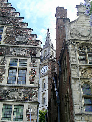 Еще на площади можно увидеть очень красивое здание старого почтамта, построенное в 1896-1909 годах. Проходим мимо церкви Святого Николая. Здесь гид обращает наше внимание на здание на противоположной стороне улицы. Это бывший дом гильдии каменщиков (Метселарсхуис), крыша которого украшена скульптурами шести танцующих дьяволят. А перед нами башня Беффруа. Она построена в XIV в., имеет высоту 95 метров, несколько веков служила в качестве сторожевой башни. Если зайти за башню, то здесь можно увидеть здание суконных рядов. Оно строилось позднее Беффруа — в XV в. Но тогда была построена только часть здания, завершение приходится на начало ХХ в.Последний пункт нашей экскурсии — здание кафедрального собора Святого Бавона на площади Sint-Baafsplein.