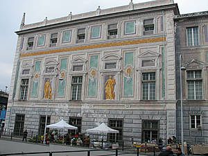 Собор и площадь Сан-Лоренцо. Что мы увидели снаружи Дальнейший путь начался с площади Сан Лоренцо по улице Scurreria пока она не закончилась перекрестком с площадью Campetto. Здание, которое было перед нами по адресу площадь Campetto, 8 стоит дворец Gio Vincenzo Imperiale. Построен в 1560 году.