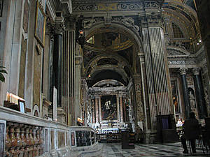 Внутренний интерьер церкви поражает обилием картин и скульптур. У главного алтаря стоят между колоннами статуи святых Петра и Павла. В районе купола можно увидеть фрески, изображающие евангелистов. Знаменита церковь и двумя полотнами кисти Рубенса. Идентифицировать картины, правда, не удалось, так как в церкви в это время шла служба.