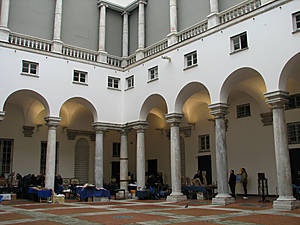 Блошиный рынок, расположенный на первом этаже подпортил впечатление о дворце, но выход через ворота и последующий осмотр главного фасада дворца изменил это мнение на 180 градусов. Герцогский дворец построен в Генуе, как резиденция дожей во времена Республики. Возведение дворца было начато в конце 13 века, в период расцвета морской генуэзской республики. В 1291 году было принято решение возвести резиденцию на городской территории, расположенной между находившимися здесь ранее церквями святого Лаврентия и святого Матвея. В новую постройку был также включен соседний дворец с башней Альберто Фьески, построенный в 1275 году и приобретенный Республикой в 1294 году. Это положило начало развитию дворца, названного Герцогским с 1339 года, когда он стал местопребыванием первого генуэзского дожа Симона Бокканегра. В 1591 на этом месте была начата закладка нового здания, с грандиозным закрытым атриумом, с примыкающими к нему с двух сторон внутренними дворами с портиками. В 1777 году дворец был перестроен в неоклассическом стиле после пожара, в 1935 году был выстроен новый фасад, выходящий на площадь де Феррари.