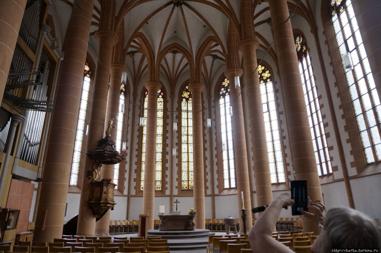 После реставрации (1978-1985) церкви вернули даже исходный цвет здания. А в интерьере все просто, колонны из красного песчаника поддерживают высокие своды церкви,
