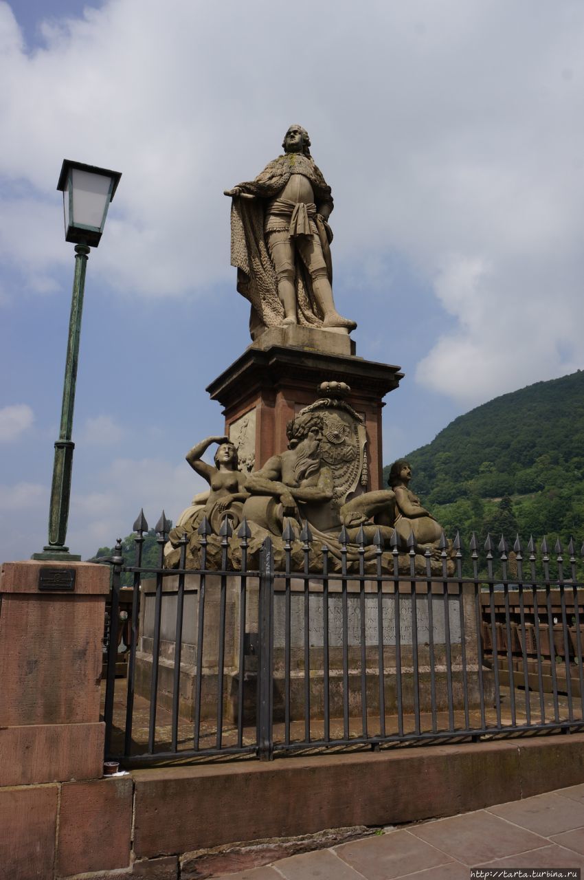 А перед мостом Бронзовая обезьяна, установленная в 1979 году вместо деревянной фигуры, указывает пальцем на зеркало и как бы говорит: «Что ты глазеешь? Не видел никогда старую обезьяну? Иди скорей в Гейдельберг, там ты увидишь более интересные вещи».