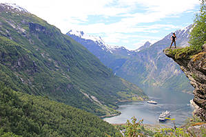 Знакомство с Гейрангерфьордом.Смотровая площадка двух зонная, между двумя плато проложена соединяющая их дорожка. В нижней зоне расположилась архитектурная инсталляция, открытая Королевой Норвегии Соней в 2003 году. Но нас если честно больше заинтересовала возможность сделать вот такое фото.