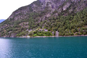На склонах гор попадаются заброшенные домики, которые удачно вписываются в пейзаж, у норвежцев это хорошо получается. Когда-то здесь были фермы, жили люди, которых, видимо, привлекала здесь уединённость. (Фин. инспекторы не надоедали, тоже плюс). К некоторым можно было добраться по суше из Герангера, а к другим только по воде, а затем по верёвочной или приставной лестнице.