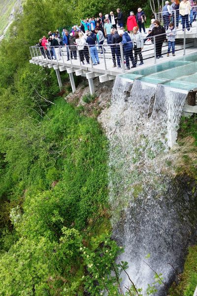 И получить возможность прикоснуться к водопаду. Эта смотровая площадка выполнена так, что водопад своим естественным путем спускается с верхотуры, потом прячется под дорогу и дальше во фьорд падает уже со специально созданной для него площадки. А все желающие имеют счастье наблюдать за всем этим. Ну и, конечно, любоваться видами фьорда с этого ракурса.