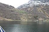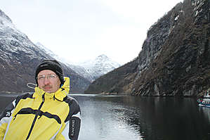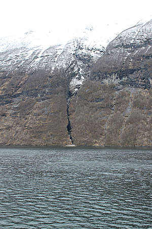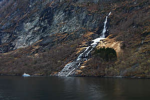 Знакомство с Гейрангерфьордом. Посадка на паром и начало экскурсии только усиливали прочитанные рассказы. Заснеженные горы, поселок Хеллесюльт, удаляющийся от нас и конечно воды фьорда. Ветер задувал , хочется написать во все паруса. На открытой палубе мерзли руки, но затвор фотоаппарата не перкращал щелкать. Так под его аккорды мы и вплыли в сам Гейрангерфьорд. Ожидание водопадов на время остановило все разговоры на палубе. И вот из динамиков слышно — посмотрите направо водопад жених, а налево семь сестер. Смотрим направо — жених имеется, а налево нет ни одной сестры. Природа еще не успела проснуться и разбудить сестер, только голые камни черные от предыдущих сезонов показывали нам, где эти сестры находятся.