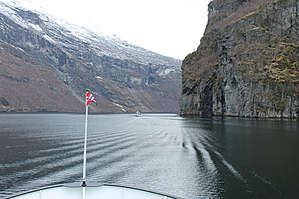Уныние не перешло в разочарование, так как навстречу проплывали лодки викингов, которые как и мы встречали друг друга радостными вскриками и гудками парома. В это время слева по ходу открылась панорама "Дороги орлов", а впереди нас уже ждал Гейрангер.