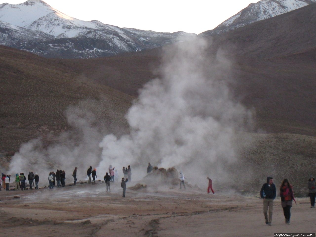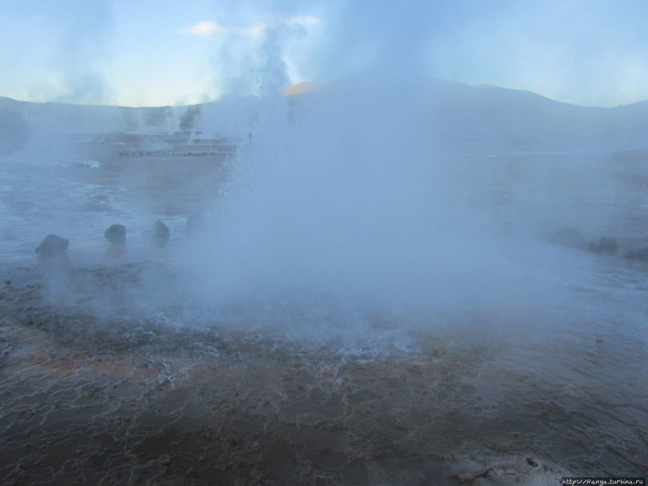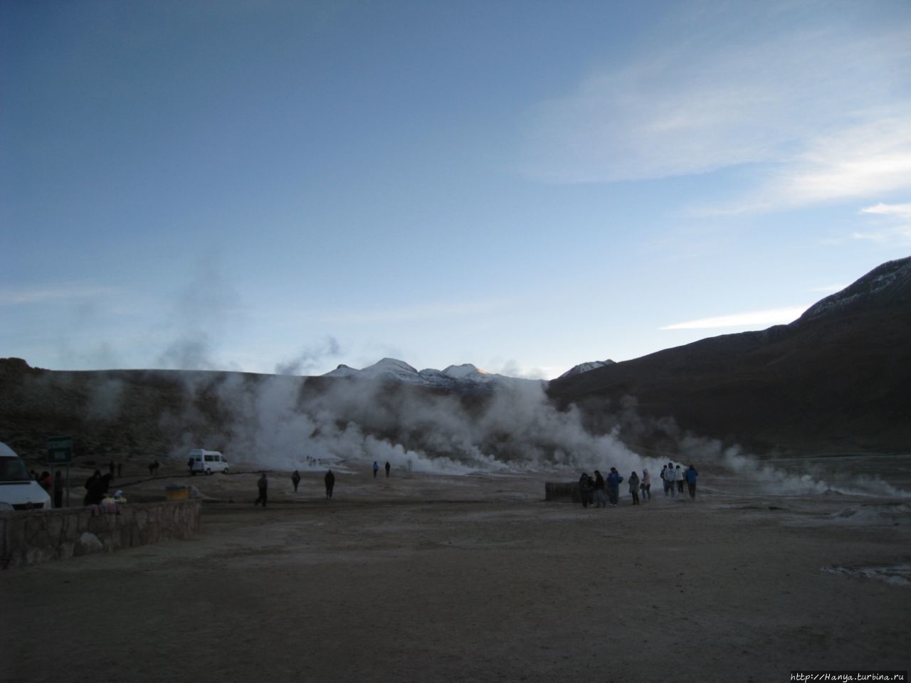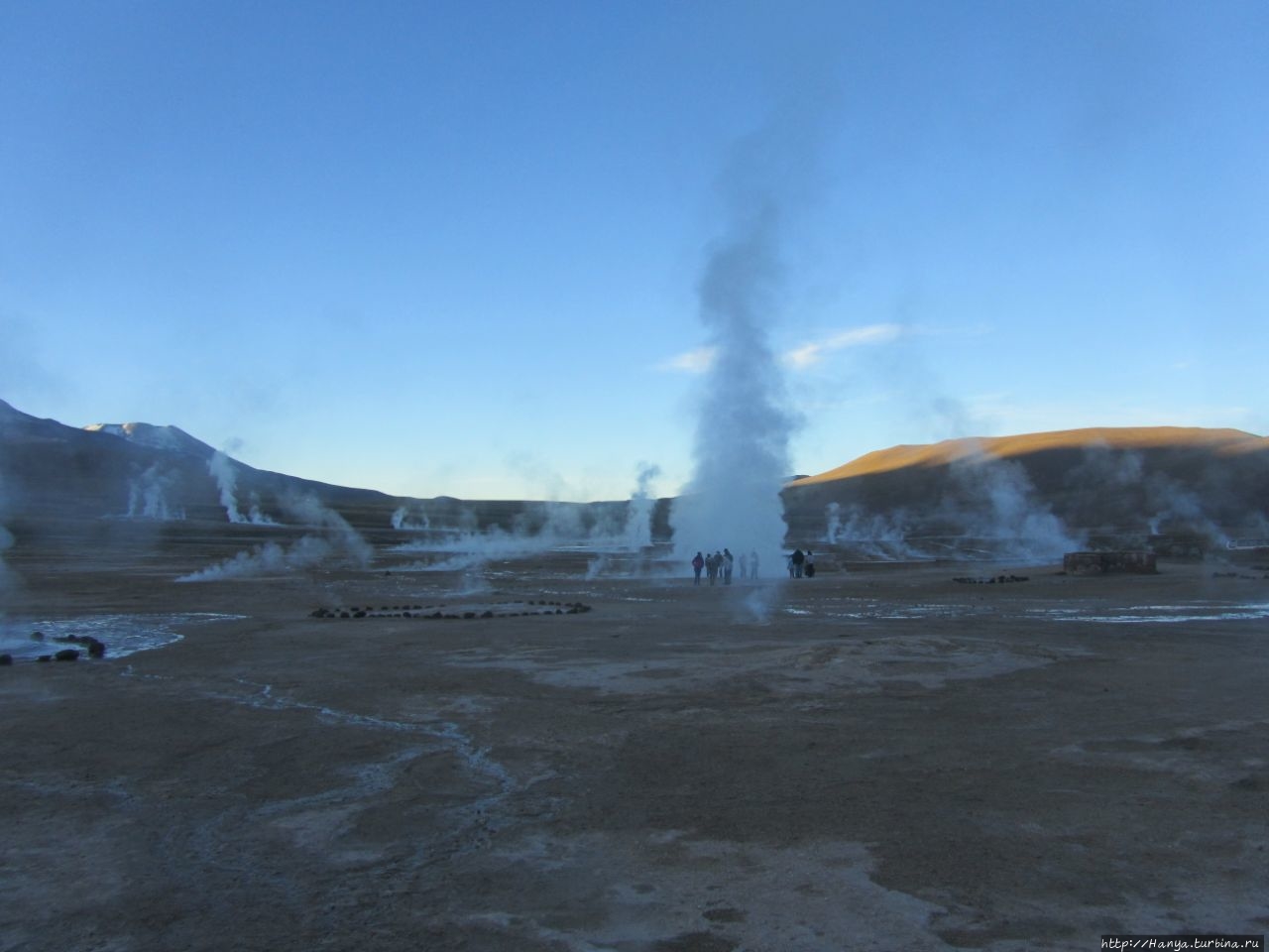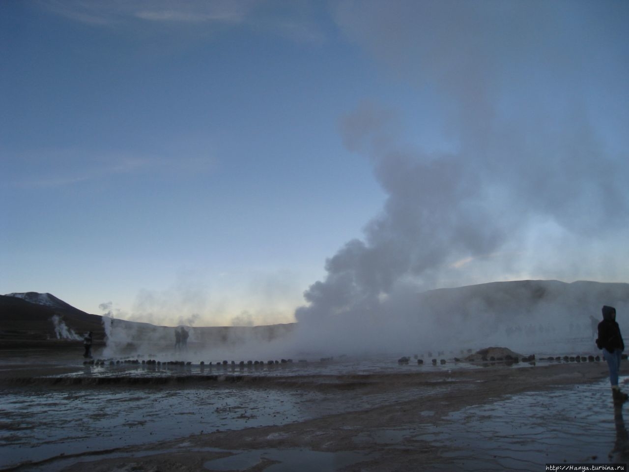 Меня беспокоило, как мой организм воспримет высоту, ведь уже тогда мы подумывали о Тибете, а я не отпускала мысль посетить и Мачу-Пикчу в Перу (и мы осуществили эту задумку в последующем). Действительность порадовала не холодом, а прохладой, жаль только что очень быстро промокли ноги. На стоянке уже скопилось достаточно много автобусов, и мы рванули за нашим гидом, чтобы застать волнительный момент восхода в живописной долине. Конечно, глаза наши уже могли видеть это уникальное зрелище, но вот фотоаппарат еще не воспринимал его, и первые кадры упорно не хотели отражать нас на фоне нескольких сот бьющих вверх мощных столбов пара. Надеялись, что пар, производимый геотермальной активностью, позволит нам сделать уникальные и таинственные фотографии, как обещано.
