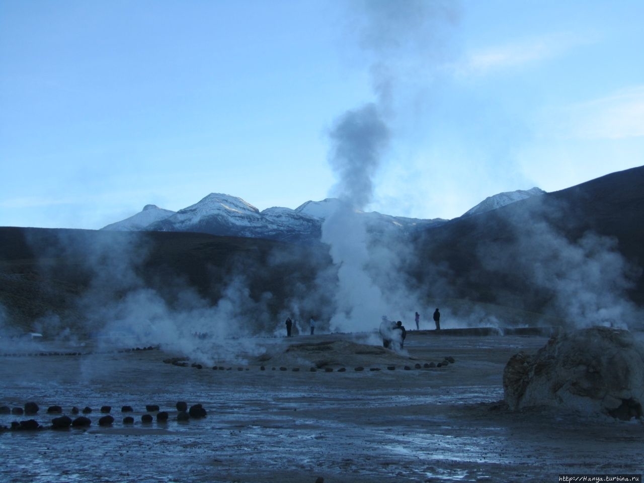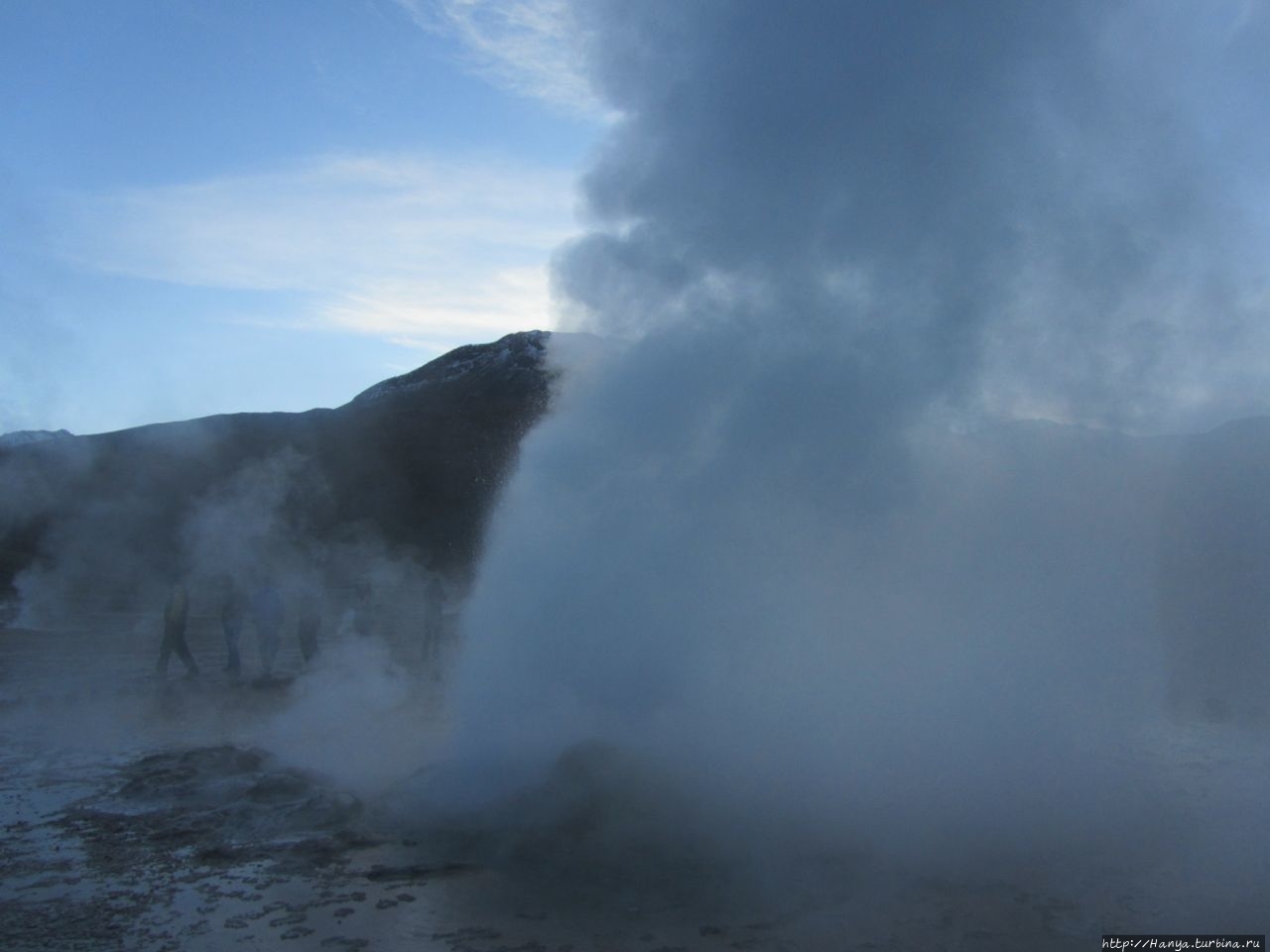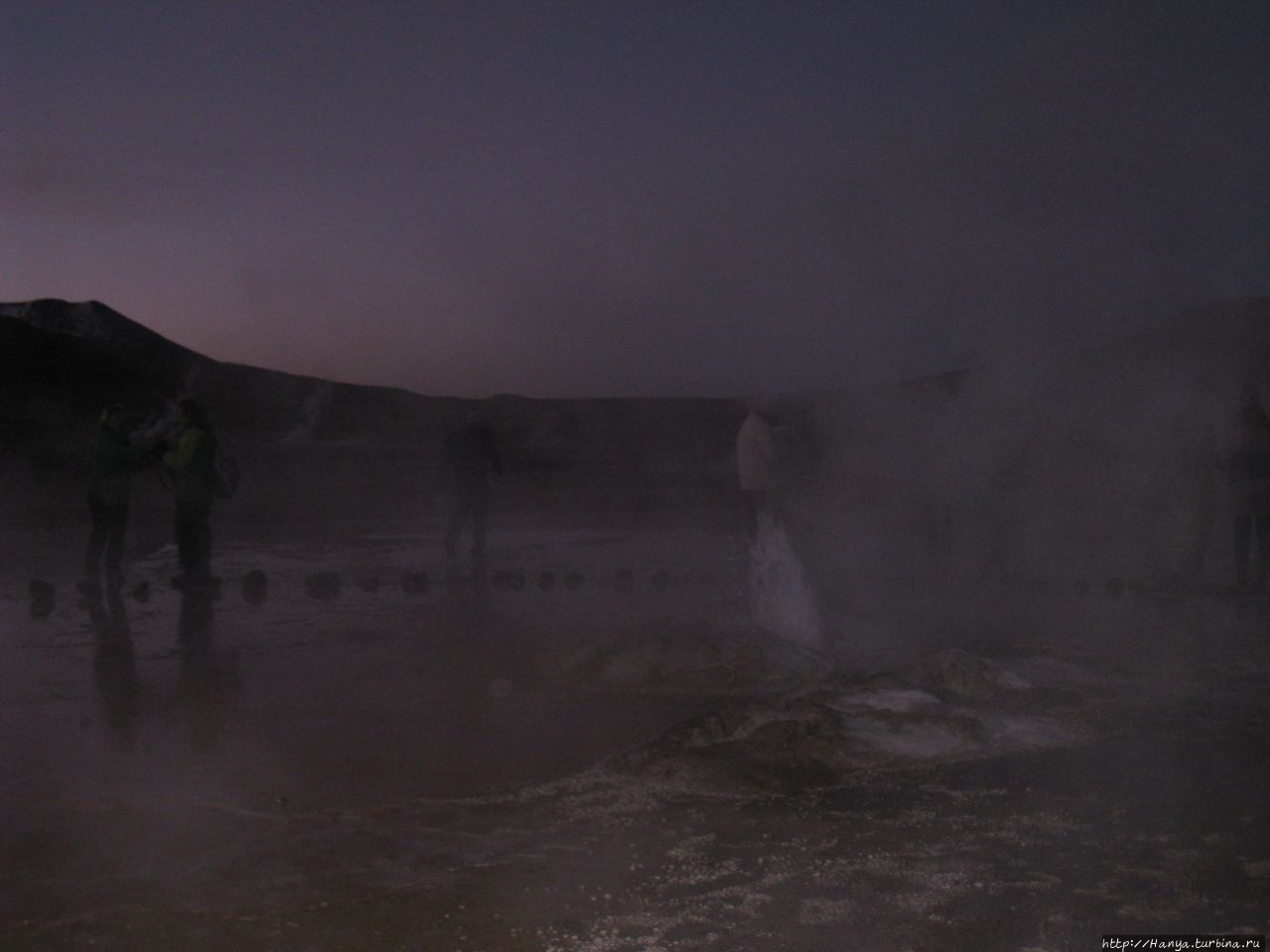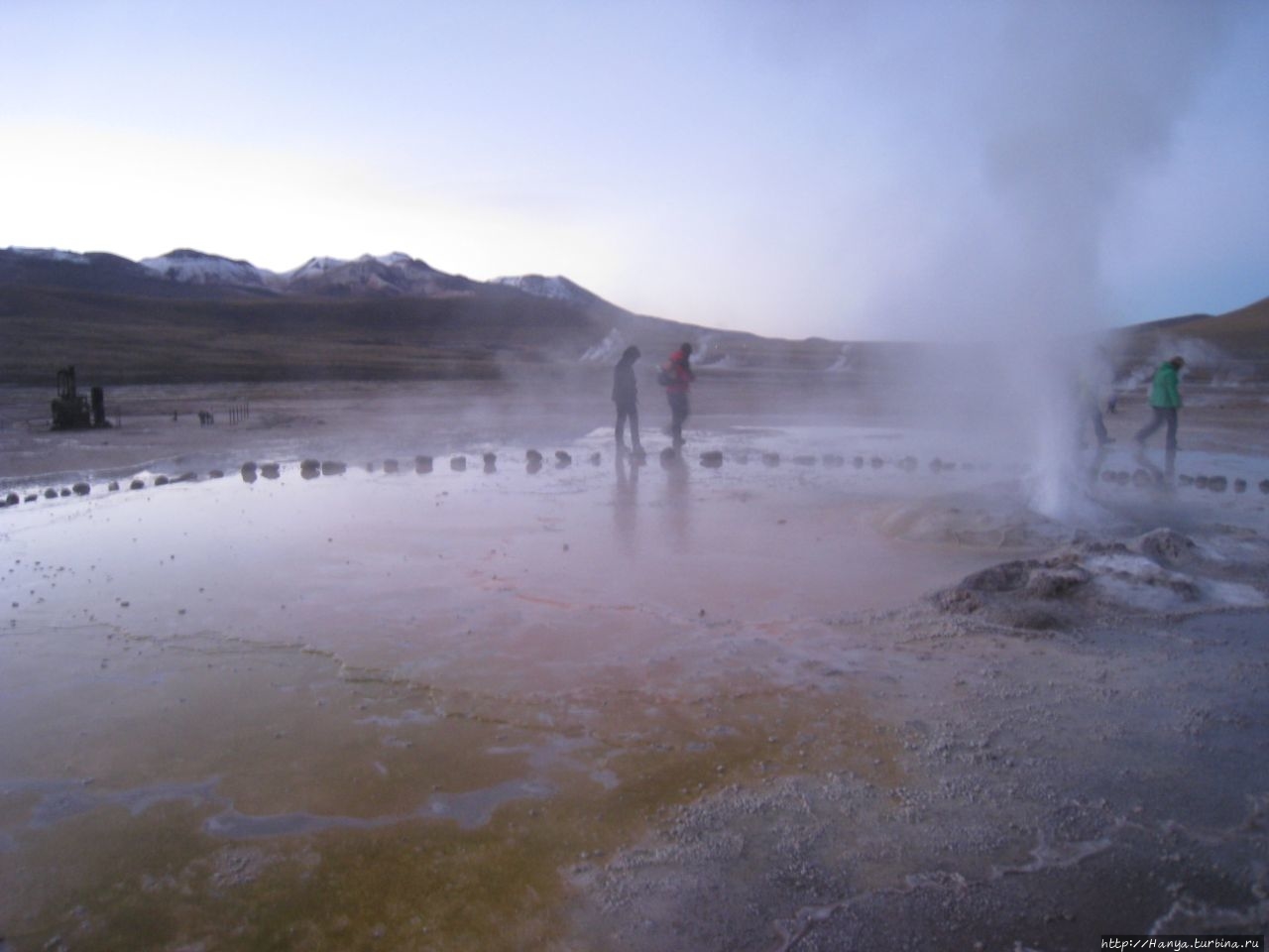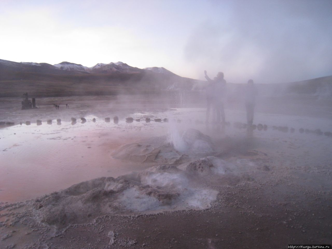 Меня беспокоило, как мой организм воспримет высоту, ведь уже тогда мы подумывали о Тибете, а я не отпускала мысль посетить и Мачу-Пикчу в Перу (и мы осуществили эту задумку в последующем). Действительность порадовала не холодом, а прохладой, жаль только что очень быстро промокли ноги. На стоянке уже скопилось достаточно много автобусов, и мы рванули за нашим гидом, чтобы застать волнительный момент восхода в живописной долине. Конечно, глаза наши уже могли видеть это уникальное зрелище, но вот фотоаппарат еще не воспринимал его, и первые кадры упорно не хотели отражать нас на фоне нескольких сот бьющих вверх мощных столбов пара. Надеялись, что пар, производимый геотермальной активностью, позволит нам сделать уникальные и таинственные фотографии, как обещано.