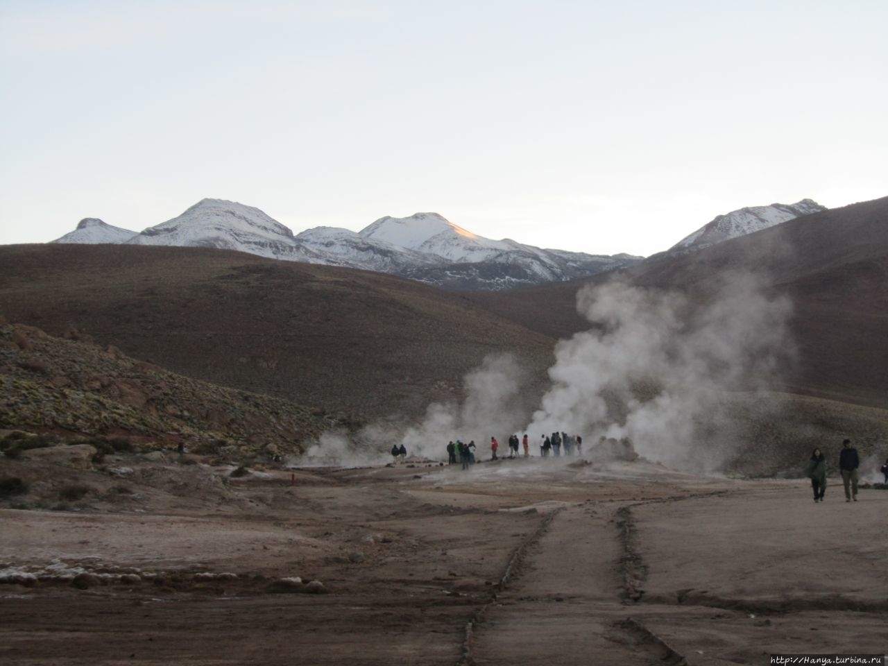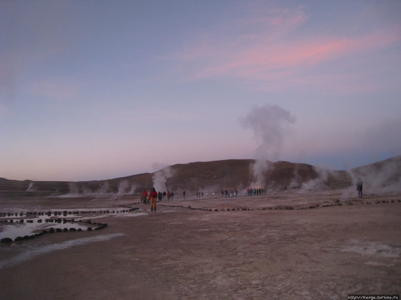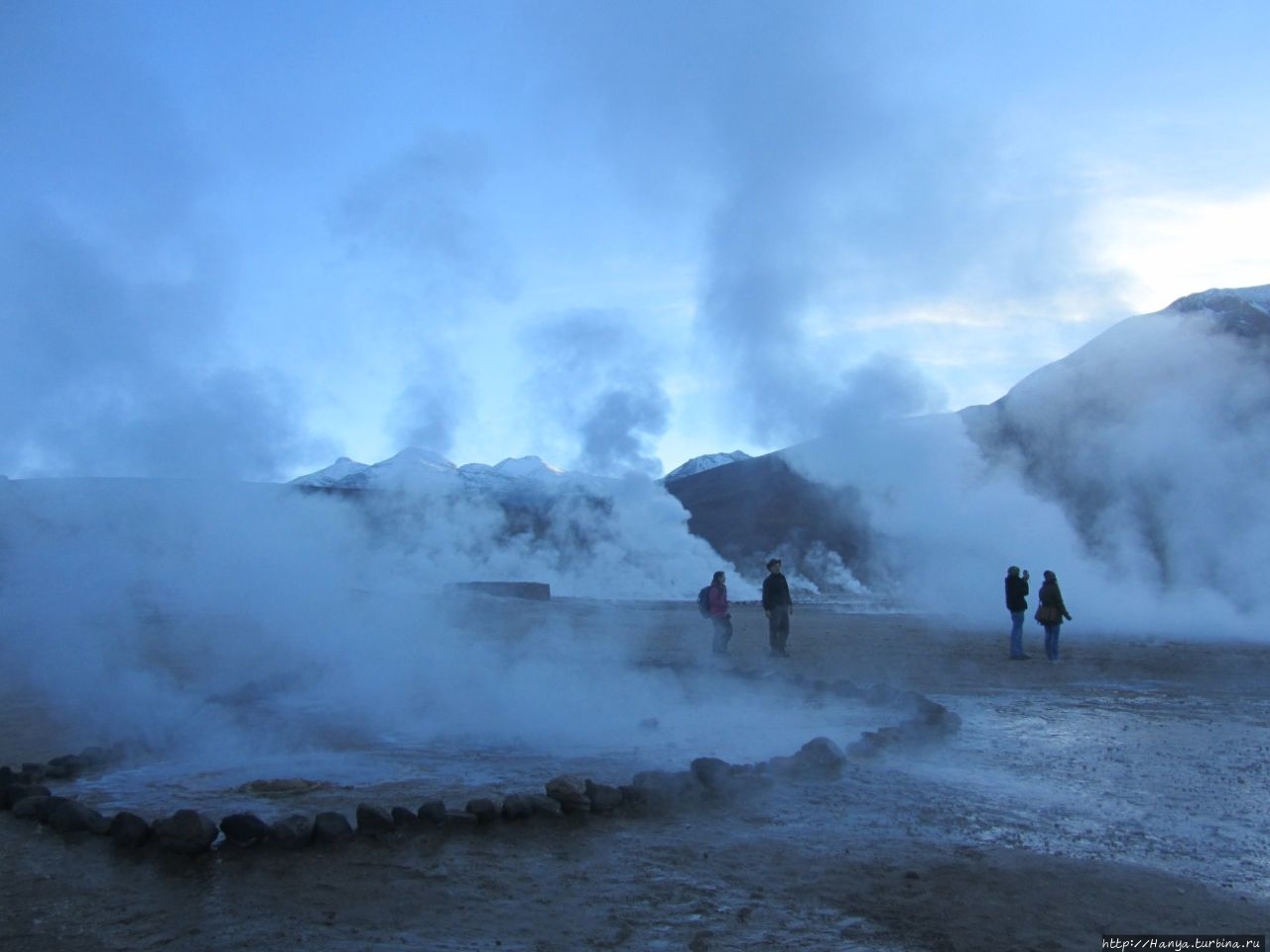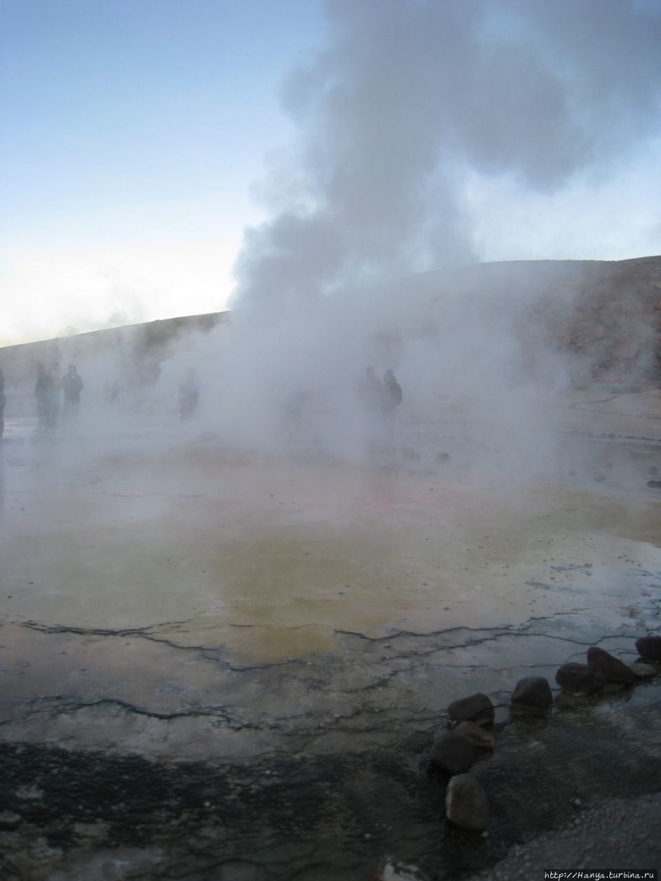 Меня беспокоило, как мой организм воспримет высоту, ведь уже тогда мы подумывали о Тибете, а я не отпускала мысль посетить и Мачу-Пикчу в Перу (и мы осуществили эту задумку в последующем). Действительность порадовала не холодом, а прохладой, жаль только что очень быстро промокли ноги. На стоянке уже скопилось достаточно много автобусов, и мы рванули за нашим гидом, чтобы застать волнительный момент восхода в живописной долине. Конечно, глаза наши уже могли видеть это уникальное зрелище, но вот фотоаппарат еще не воспринимал его, и первые кадры упорно не хотели отражать нас на фоне нескольких сот бьющих вверх мощных столбов пара. Надеялись, что пар, производимый геотермальной активностью, позволит нам сделать уникальные и таинственные фотографии, как обещано.