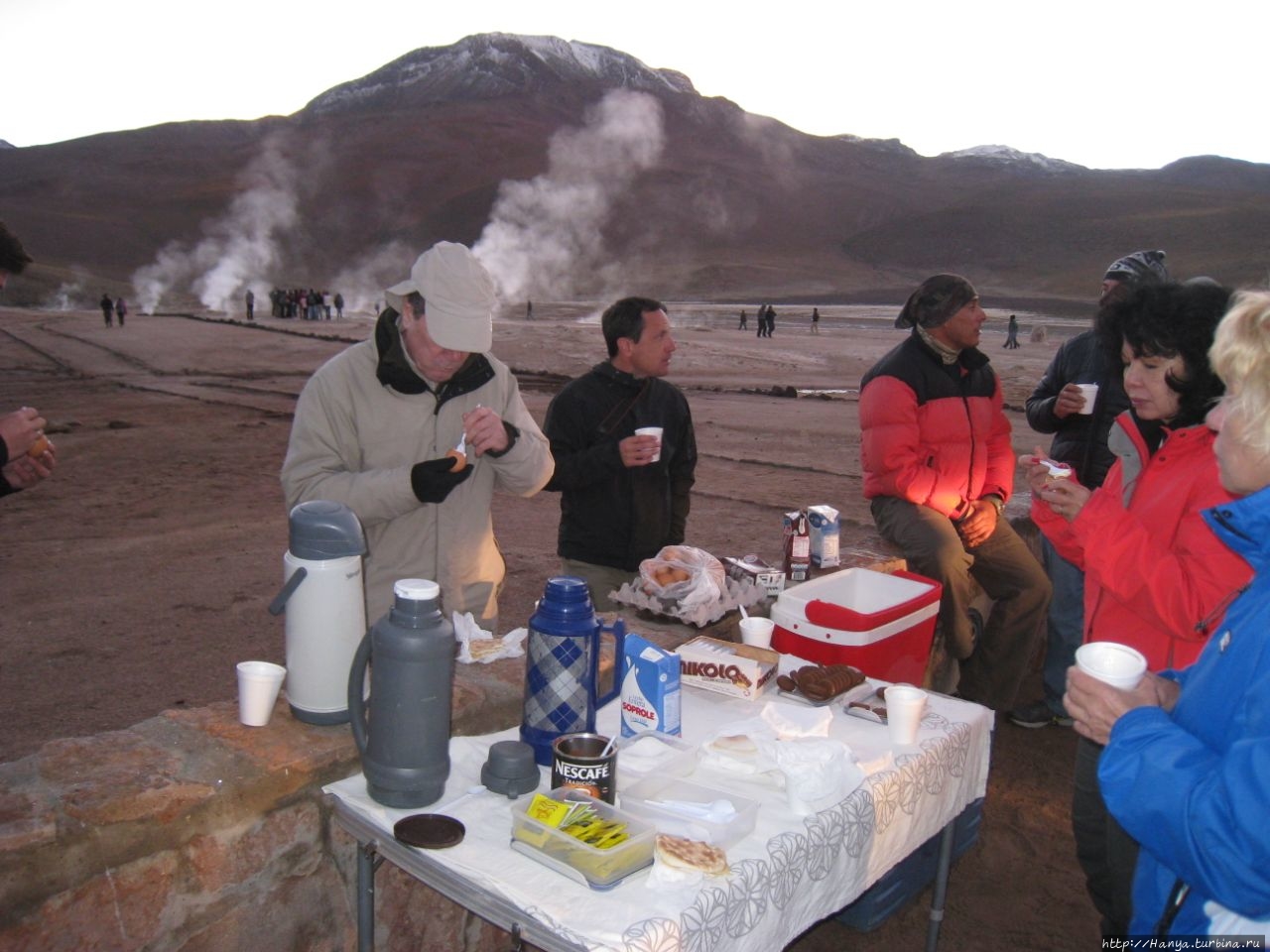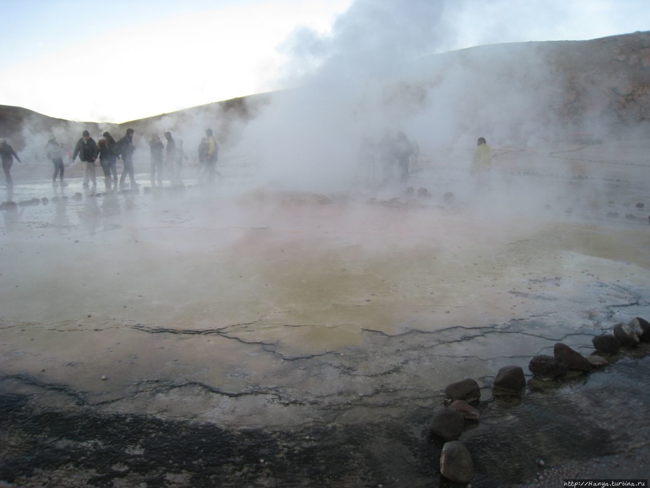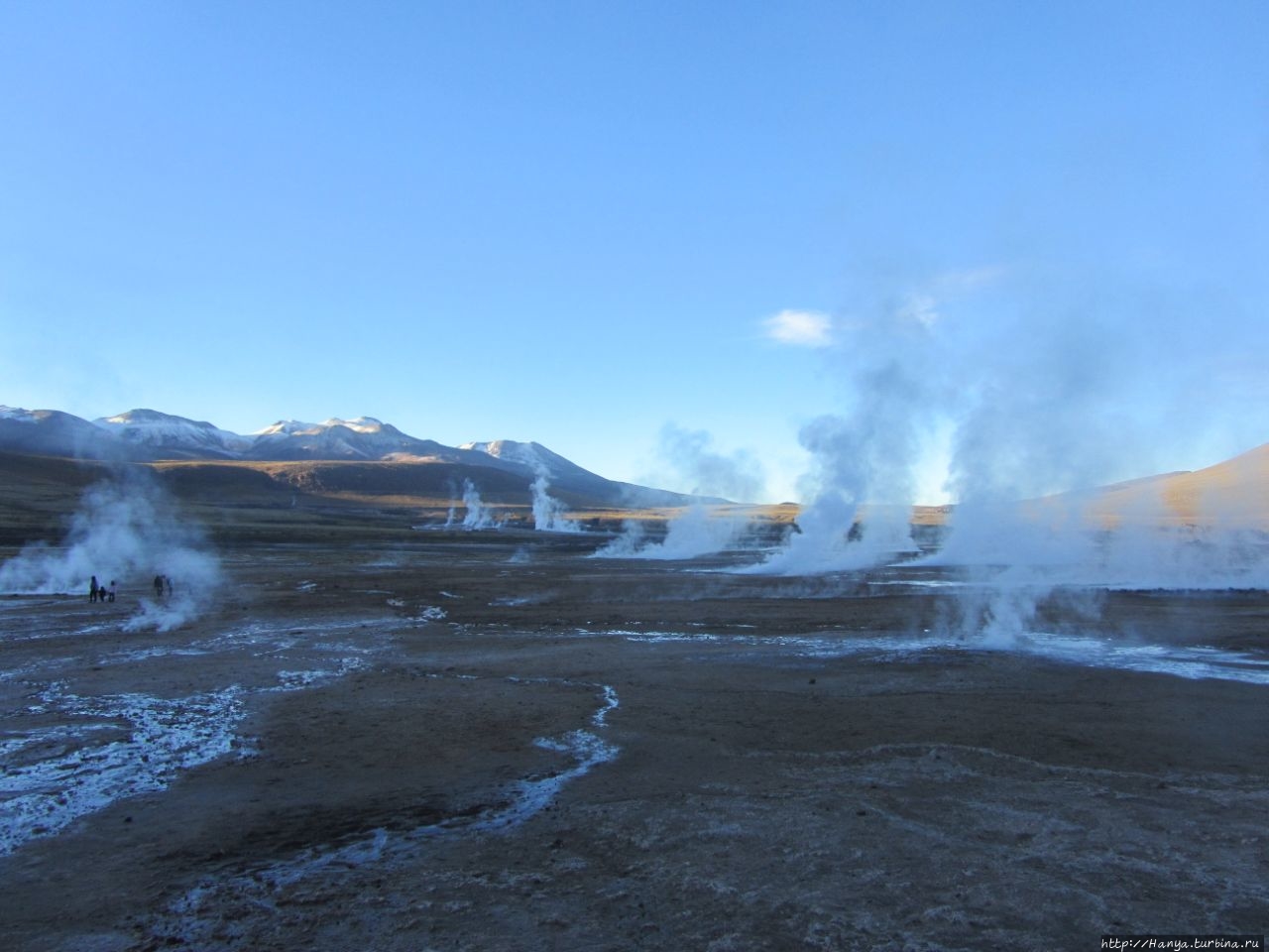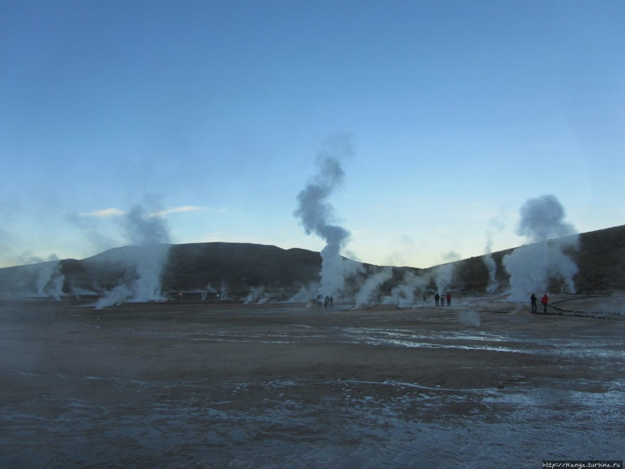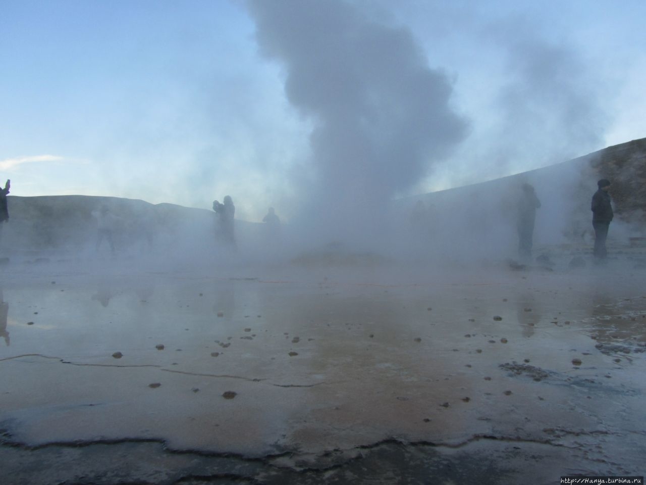 Меня беспокоило, как мой организм воспримет высоту, ведь уже тогда мы подумывали о Тибете, а я не отпускала мысль посетить и Мачу-Пикчу в Перу (и мы осуществили эту задумку в последующем). Действительность порадовала не холодом, а прохладой, жаль только что очень быстро промокли ноги. На стоянке уже скопилось достаточно много автобусов, и мы рванули за нашим гидом, чтобы застать волнительный момент восхода в живописной долине. Конечно, глаза наши уже могли видеть это уникальное зрелище, но вот фотоаппарат еще не воспринимал его, и первые кадры упорно не хотели отражать нас на фоне нескольких сот бьющих вверх мощных столбов пара. Надеялись, что пар, производимый геотермальной активностью, позволит нам сделать уникальные и таинственные фотографии, как обещано.