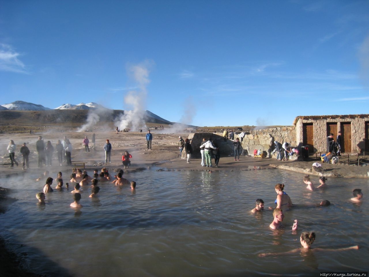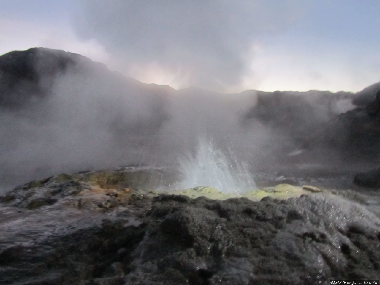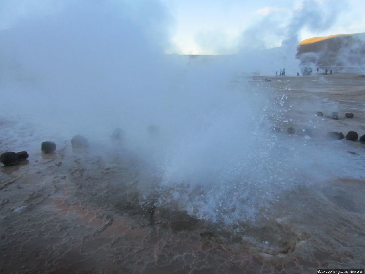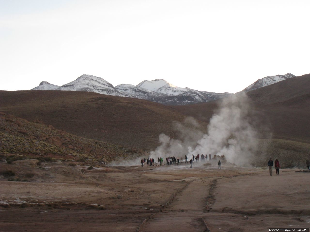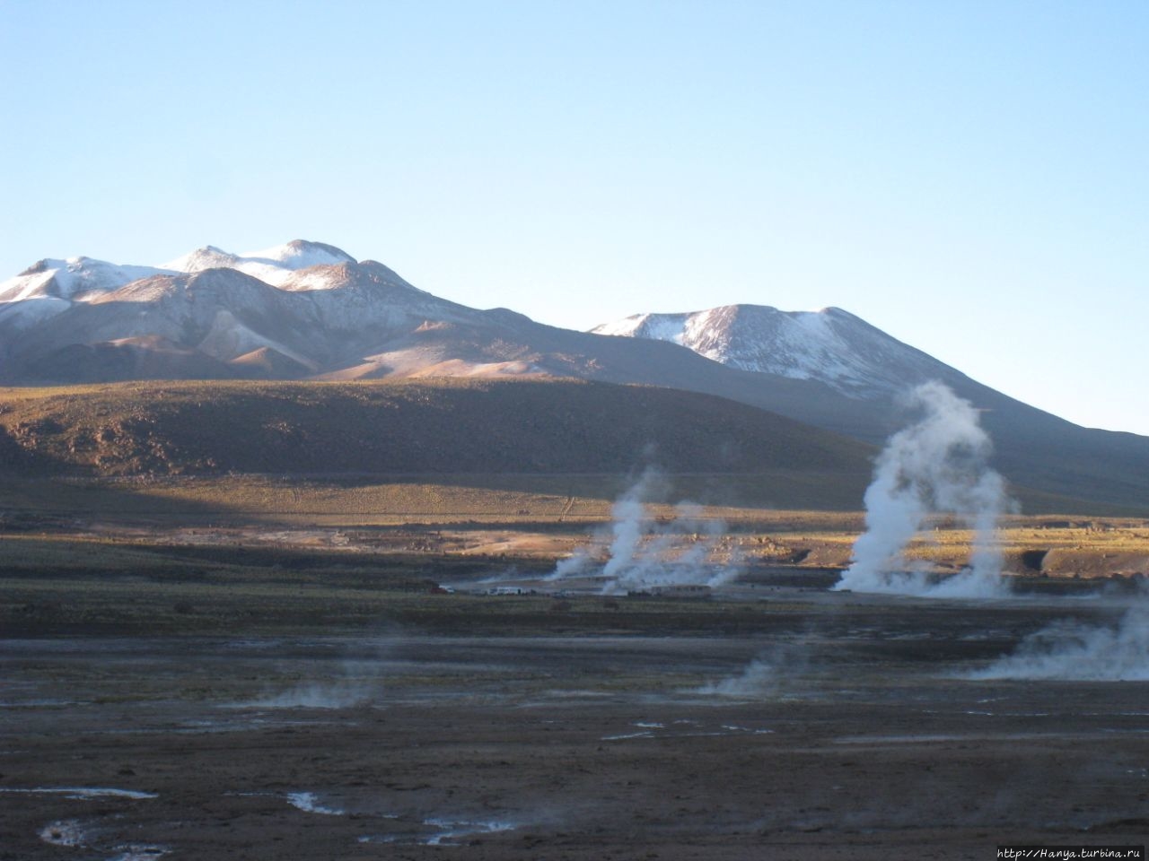 Меня беспокоило, как мой организм воспримет высоту, ведь уже тогда мы подумывали о Тибете, а я не отпускала мысль посетить и Мачу-Пикчу в Перу (и мы осуществили эту задумку в последующем). Действительность порадовала не холодом, а прохладой, жаль только что очень быстро промокли ноги. На стоянке уже скопилось достаточно много автобусов, и мы рванули за нашим гидом, чтобы застать волнительный момент восхода в живописной долине. Конечно, глаза наши уже могли видеть это уникальное зрелище, но вот фотоаппарат еще не воспринимал его, и первые кадры упорно не хотели отражать нас на фоне нескольких сот бьющих вверх мощных столбов пара. Надеялись, что пар, производимый геотермальной активностью, позволит нам сделать уникальные и таинственные фотографии, как обещано.