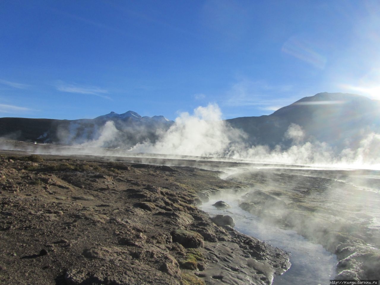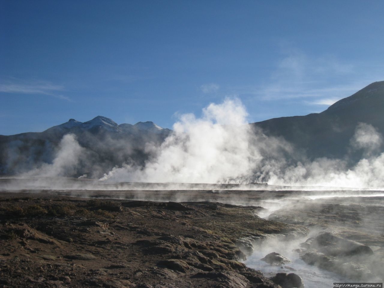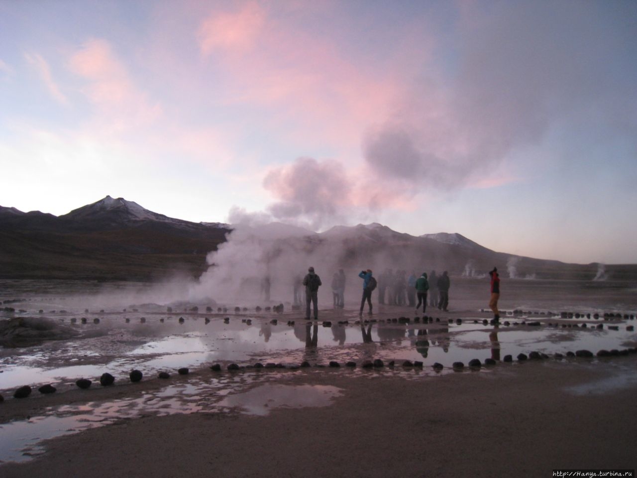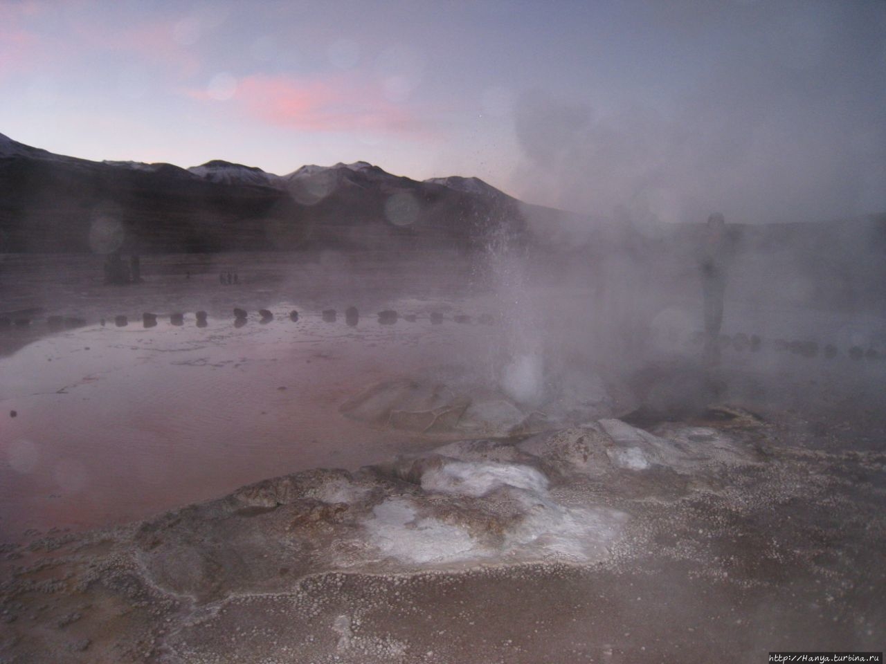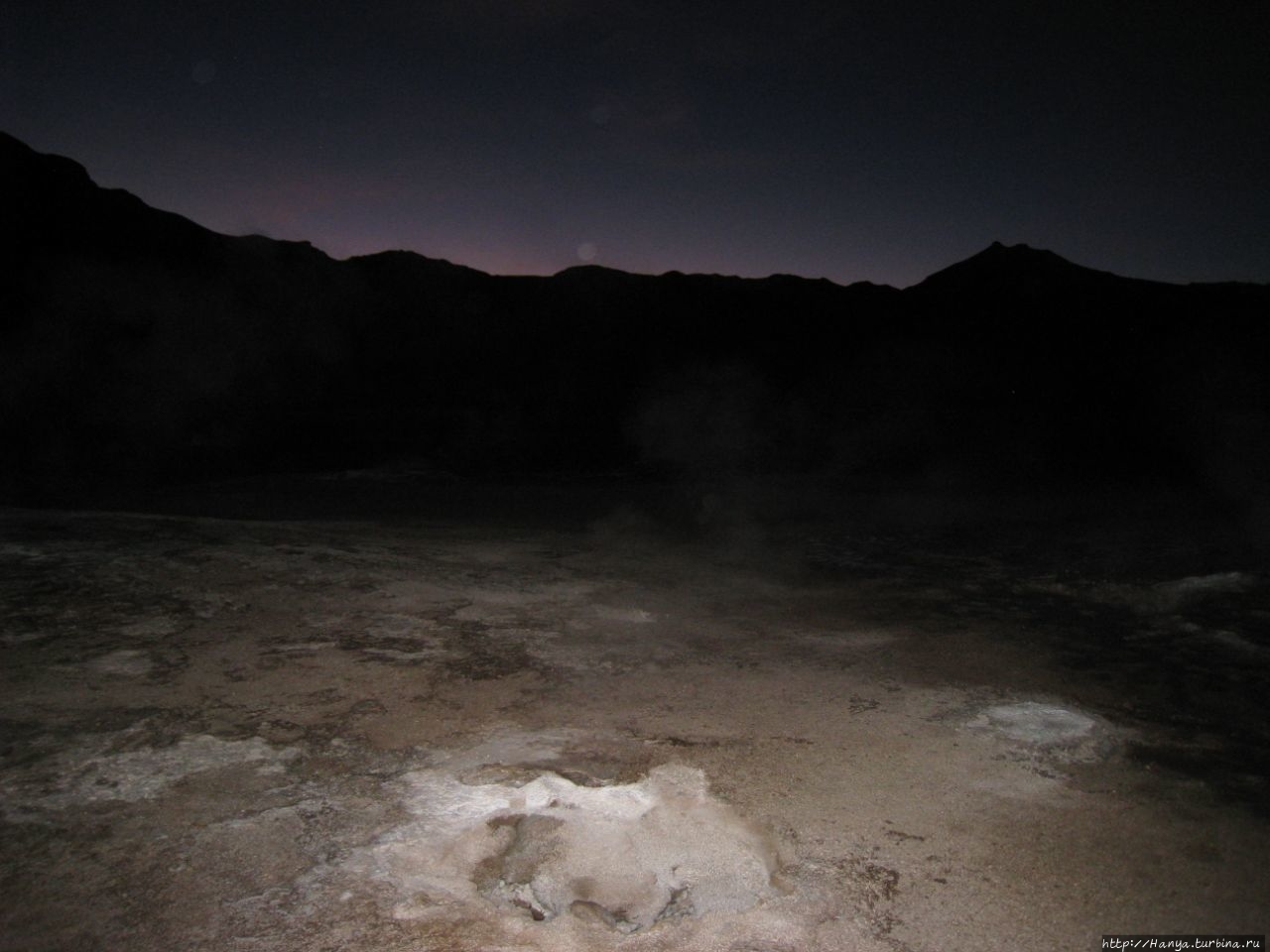 Сюрреалистические пейзажи Лагуны Чакса. Ч.45). Ранний подъем сегодня был настолько ранним (3.30), что непонятно был ли смысл спать вообще. В обозначенное время нам постучали в дверь, и мы пошли за своим lunch-box и даже успели выпить кофе с печеньем, предоставленным отелем. Оставшееся время до начала тура любовались черным звездным небом и молили бога, чтобы погода не испортилась. Еще дома нас предупредили, что перепады температур в Долине гейзеров Татио, куда сегодня по плану мы ехали, могут быть очень существенными и надо одеваться тепло. Поскольку опыта посещения геотермальных источников у нас не было, мы проигнорировали необходимость утепляться до -15 градусов, и собственно, оказались правы. Единственно, на что надо обратить внимание – это обувь, чтобы она не промокала. Группа туристов, уже сидевших в автобусе, насторожила нас – практически все были одеты в пуховики, и наши легенькие курточки вызвали у них недоумение во взглядах. Ну да ведь мы – северный народ, и нам все нипочем!Заехав за последними туристами, мы вырулили на старт самого удивительного тура в Сан Педро де Атакама. Нам предстояло преодолеть 95 км пути к северу, но экстремальная серпантинная дорога и соответствующая тряска не дала возможности поспать. Именно за этот ночной риск туристам не рекомендуется ехать к гейзерам самостоятельно, а ехать надо именно к определенному часу, так как «часы работы гейзеров» ограничены временным отрезком от 4 утра до 7.00. Именно в этот период природа распорядилась так, что мощные струи пара вырываются из отверстий, заполняя долину клубами пара, а встающее рассветное солнце добавляет красок в эту незабываемую картину, близкую по палитре к картинам Ренуара или Рериха.