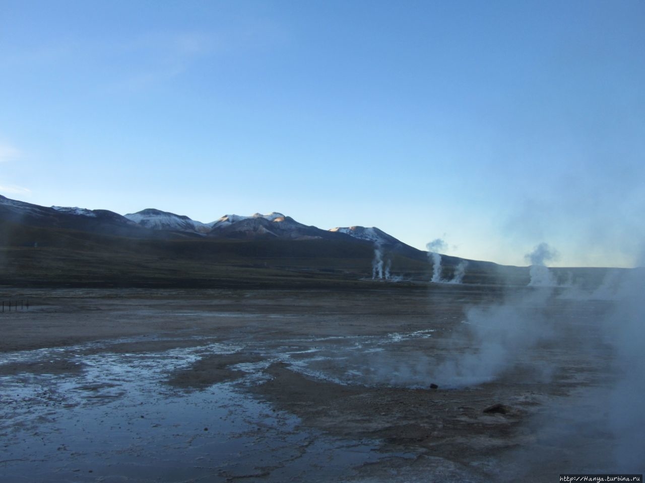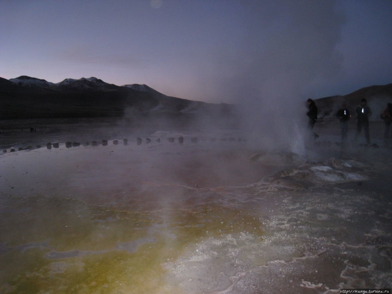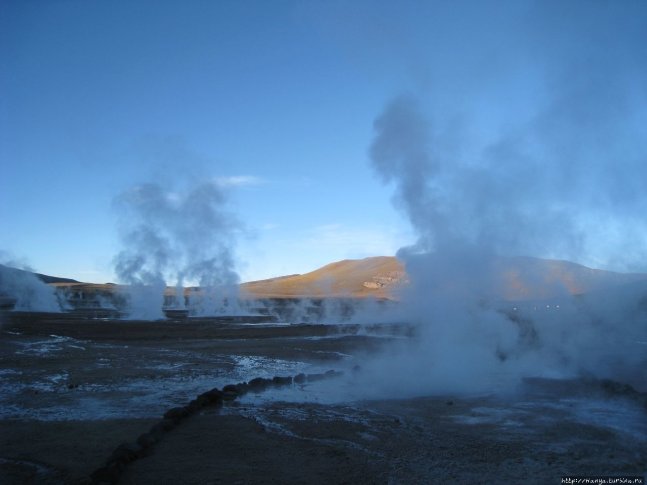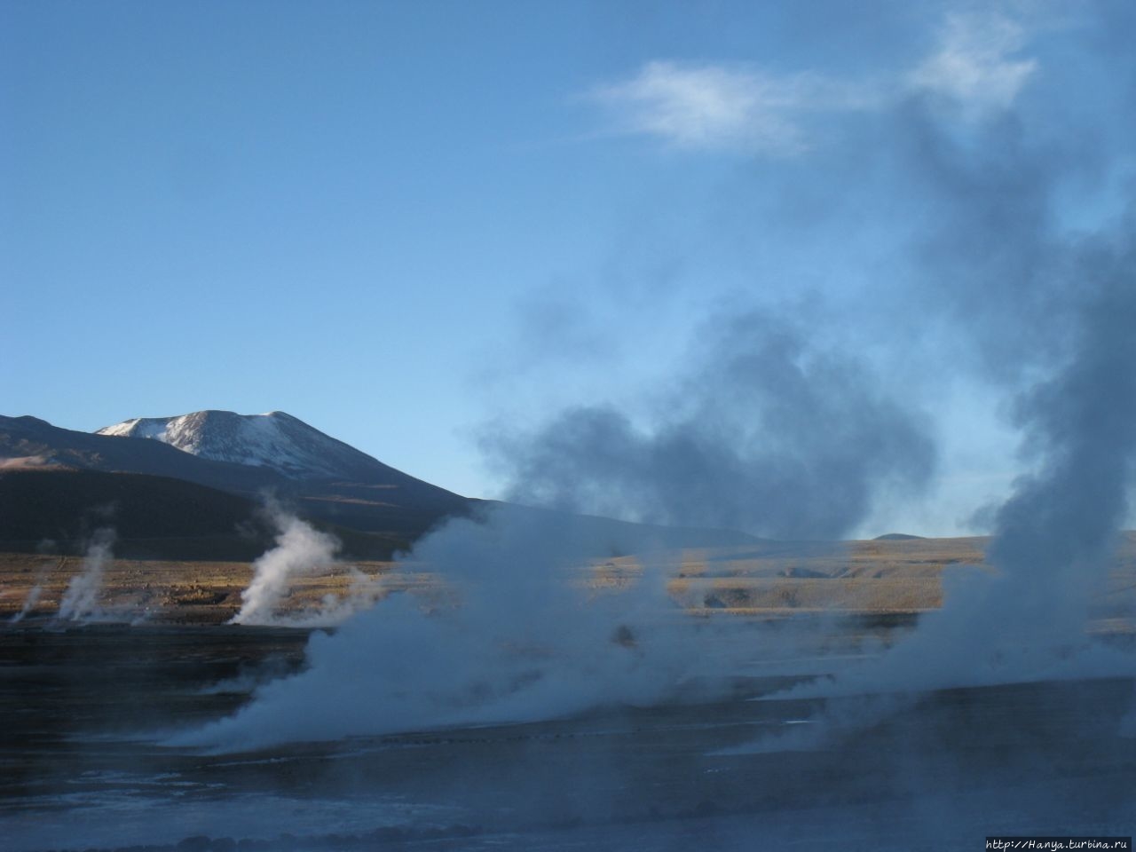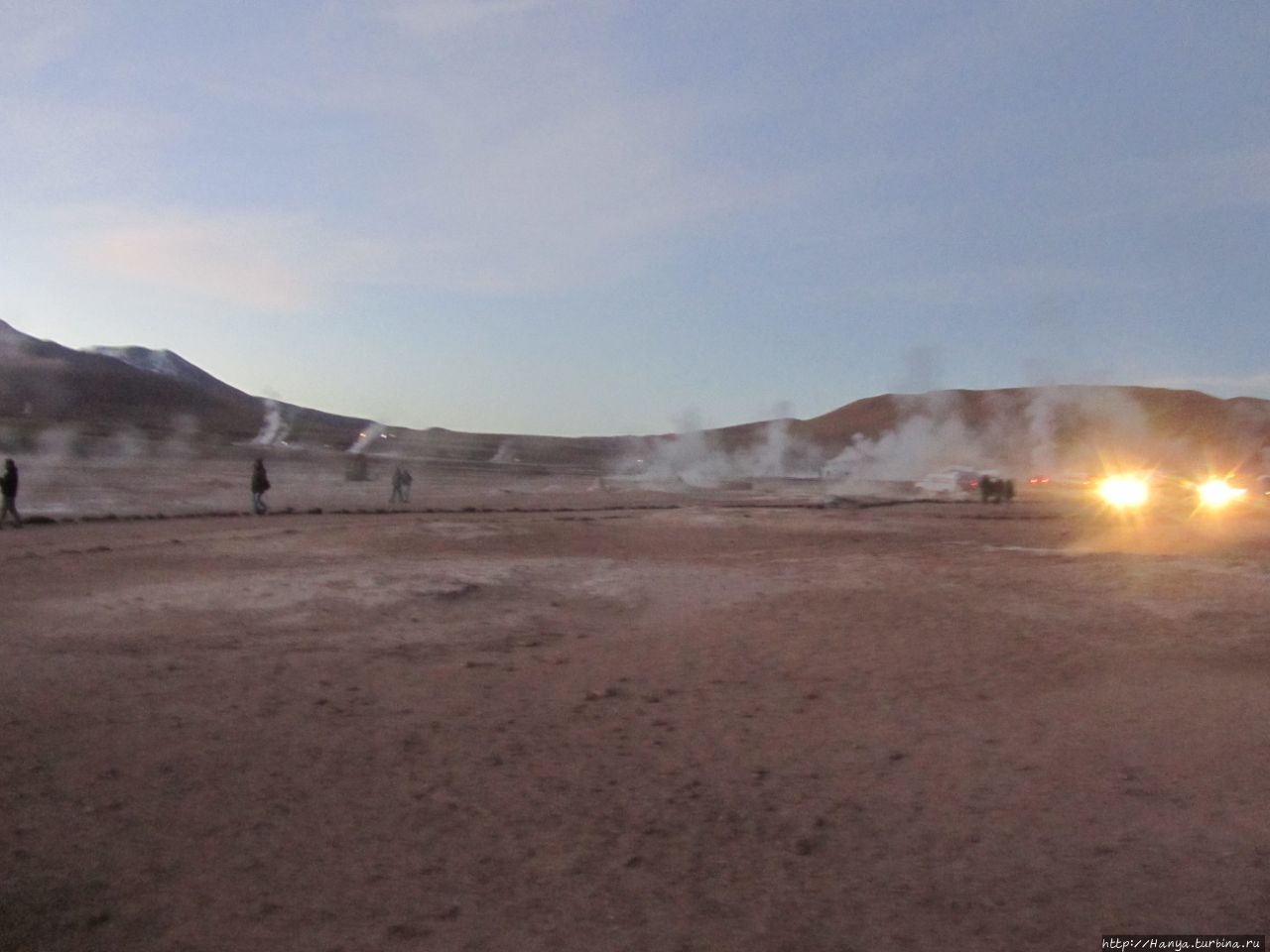 Сюрреалистические пейзажи Лагуны Чакса. Ч.45). Ранний подъем сегодня был настолько ранним (3.30), что непонятно был ли смысл спать вообще. В обозначенное время нам постучали в дверь, и мы пошли за своим lunch-box и даже успели выпить кофе с печеньем, предоставленным отелем. Оставшееся время до начала тура любовались черным звездным небом и молили бога, чтобы погода не испортилась. Еще дома нас предупредили, что перепады температур в Долине гейзеров Татио, куда сегодня по плану мы ехали, могут быть очень существенными и надо одеваться тепло. Поскольку опыта посещения геотермальных источников у нас не было, мы проигнорировали необходимость утепляться до -15 градусов, и собственно, оказались правы. Единственно, на что надо обратить внимание – это обувь, чтобы она не промокала. Группа туристов, уже сидевших в автобусе, насторожила нас – практически все были одеты в пуховики, и наши легенькие курточки вызвали у них недоумение во взглядах. Ну да ведь мы – северный народ, и нам все нипочем!Заехав за последними туристами, мы вырулили на старт самого удивительного тура в Сан Педро де Атакама. Нам предстояло преодолеть 95 км пути к северу, но экстремальная серпантинная дорога и соответствующая тряска не дала возможности поспать. Именно за этот ночной риск туристам не рекомендуется ехать к гейзерам самостоятельно, а ехать надо именно к определенному часу, так как «часы работы гейзеров» ограничены временным отрезком от 4 утра до 7.00. Именно в этот период природа распорядилась так, что мощные струи пара вырываются из отверстий, заполняя долину клубами пара, а встающее рассветное солнце добавляет красок в эту незабываемую картину, близкую по палитре к картинам Ренуара или Рериха.