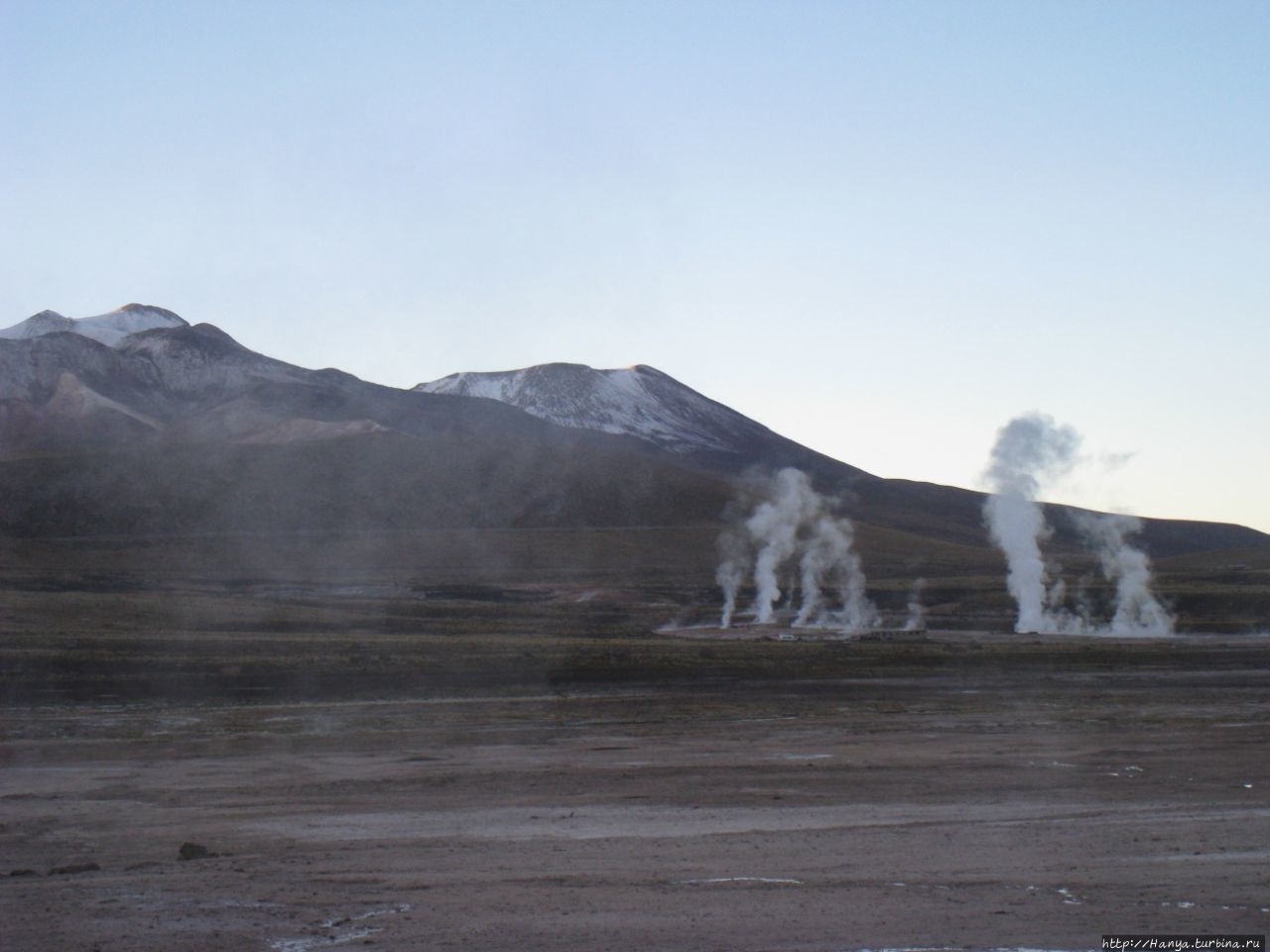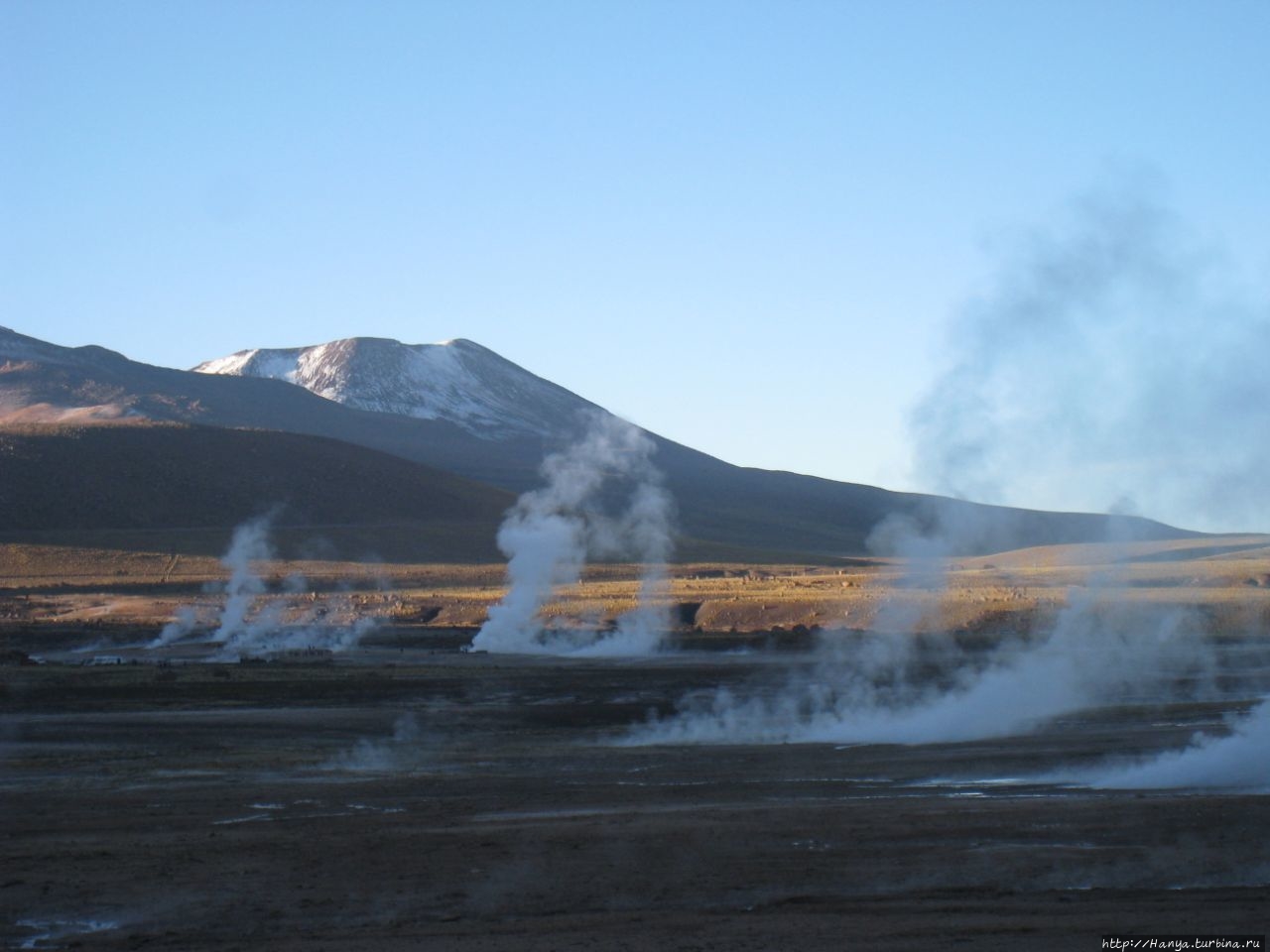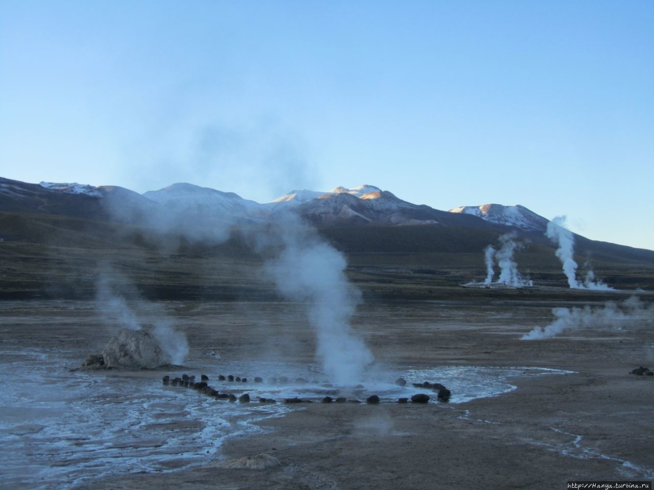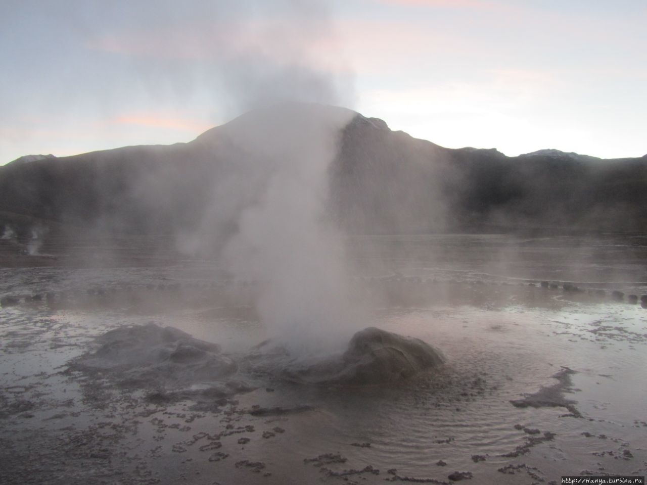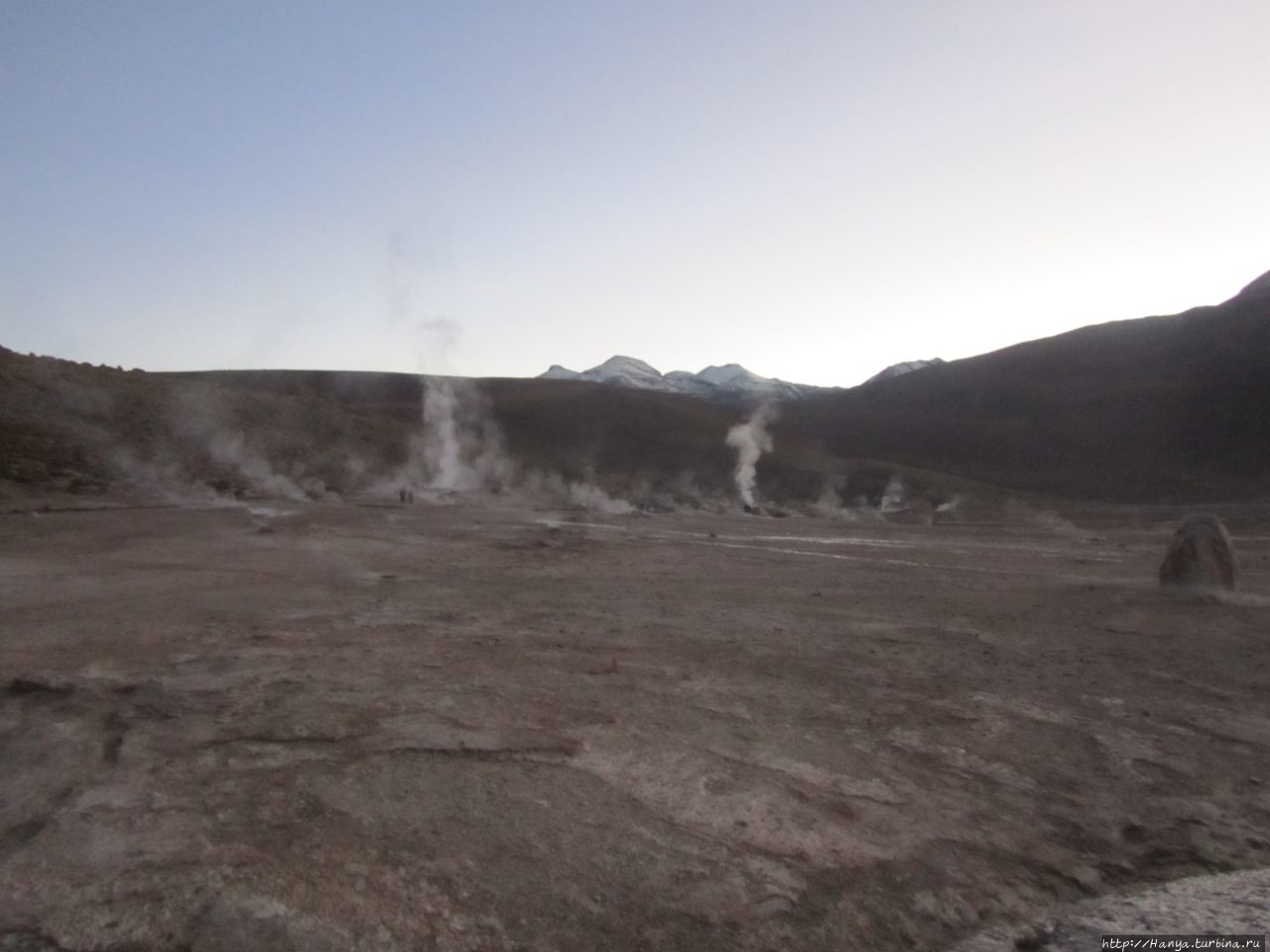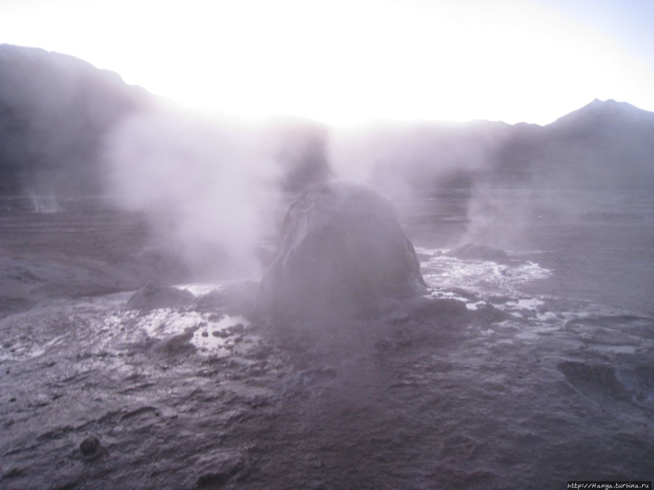 Сюрреалистические пейзажи Лагуны Чакса. Ч.45). Ранний подъем сегодня был настолько ранним (3.30), что непонятно был ли смысл спать вообще. В обозначенное время нам постучали в дверь, и мы пошли за своим lunch-box и даже успели выпить кофе с печеньем, предоставленным отелем. Оставшееся время до начала тура любовались черным звездным небом и молили бога, чтобы погода не испортилась. Еще дома нас предупредили, что перепады температур в Долине гейзеров Татио, куда сегодня по плану мы ехали, могут быть очень существенными и надо одеваться тепло. Поскольку опыта посещения геотермальных источников у нас не было, мы проигнорировали необходимость утепляться до -15 градусов, и собственно, оказались правы. Единственно, на что надо обратить внимание – это обувь, чтобы она не промокала. Группа туристов, уже сидевших в автобусе, насторожила нас – практически все были одеты в пуховики, и наши легенькие курточки вызвали у них недоумение во взглядах. Ну да ведь мы – северный народ, и нам все нипочем!Заехав за последними туристами, мы вырулили на старт самого удивительного тура в Сан Педро де Атакама. Нам предстояло преодолеть 95 км пути к северу, но экстремальная серпантинная дорога и соответствующая тряска не дала возможности поспать. Именно за этот ночной риск туристам не рекомендуется ехать к гейзерам самостоятельно, а ехать надо именно к определенному часу, так как «часы работы гейзеров» ограничены временным отрезком от 4 утра до 7.00. Именно в этот период природа распорядилась так, что мощные струи пара вырываются из отверстий, заполняя долину клубами пара, а встающее рассветное солнце добавляет красок в эту незабываемую картину, близкую по палитре к картинам Ренуара или Рериха.