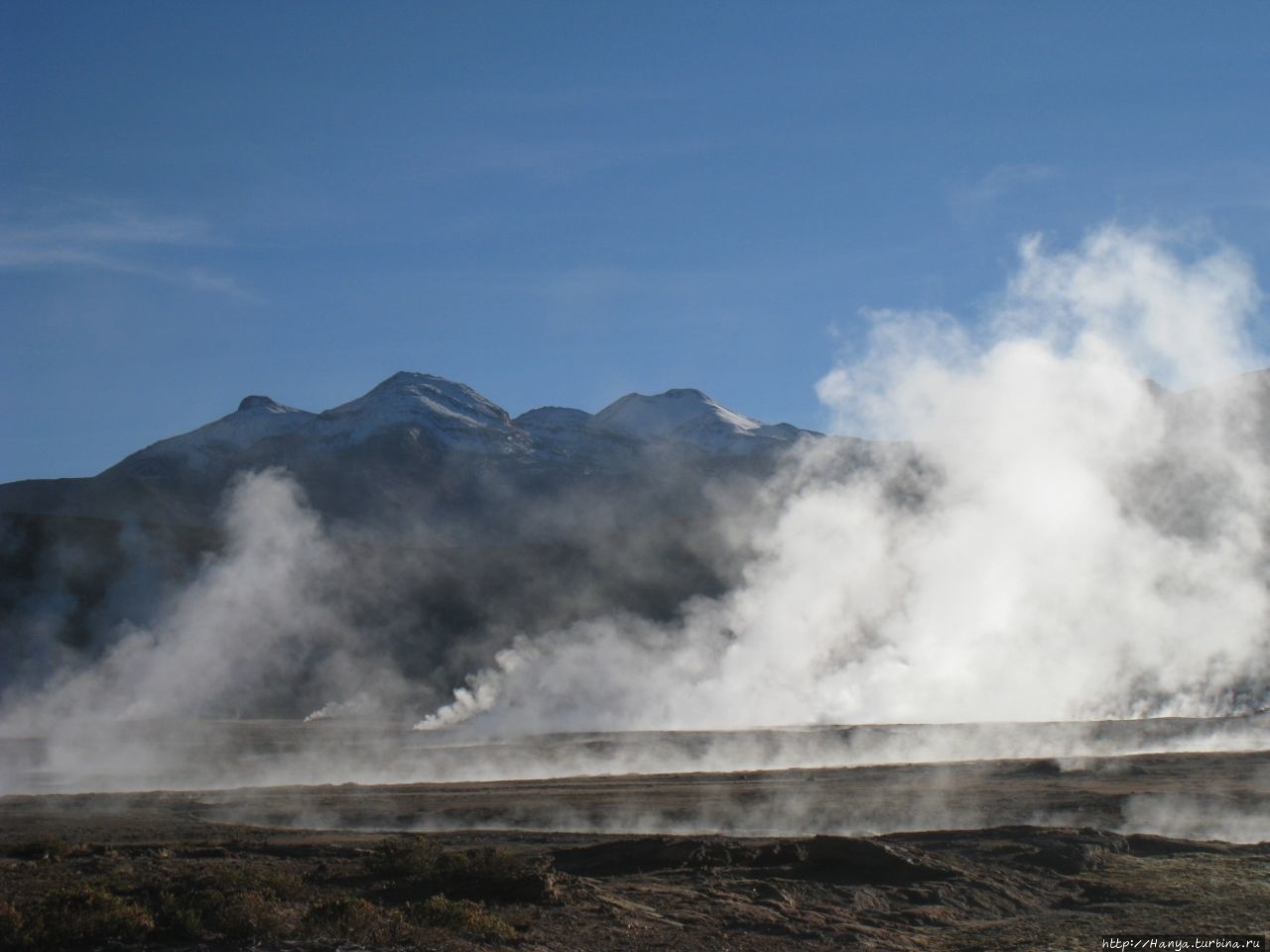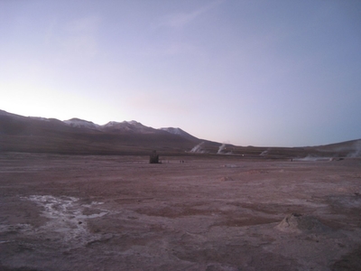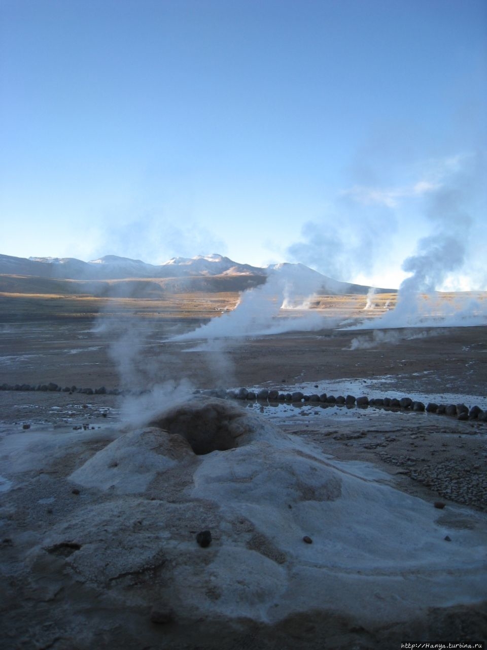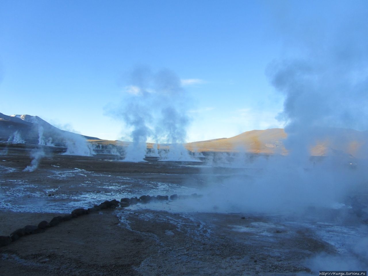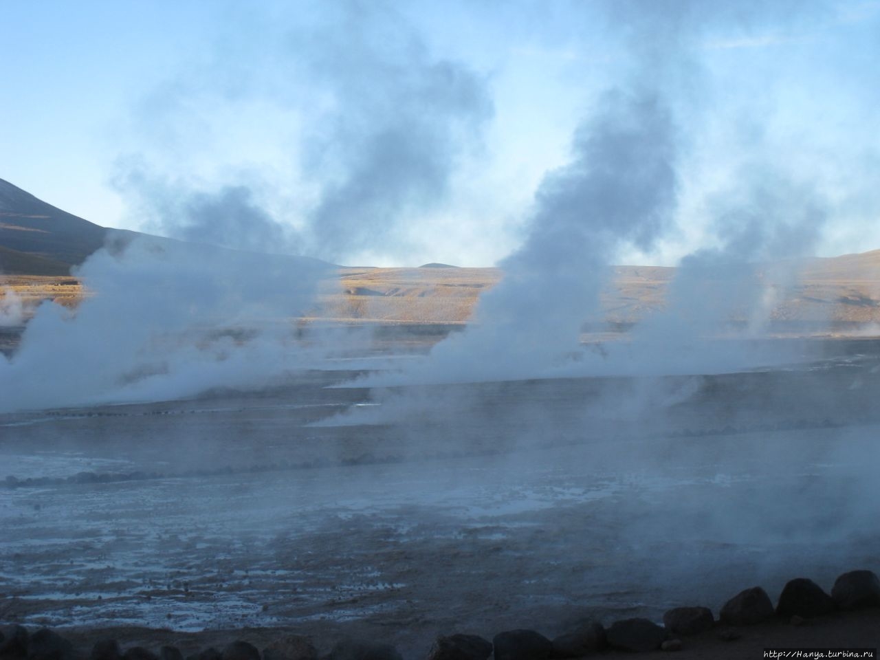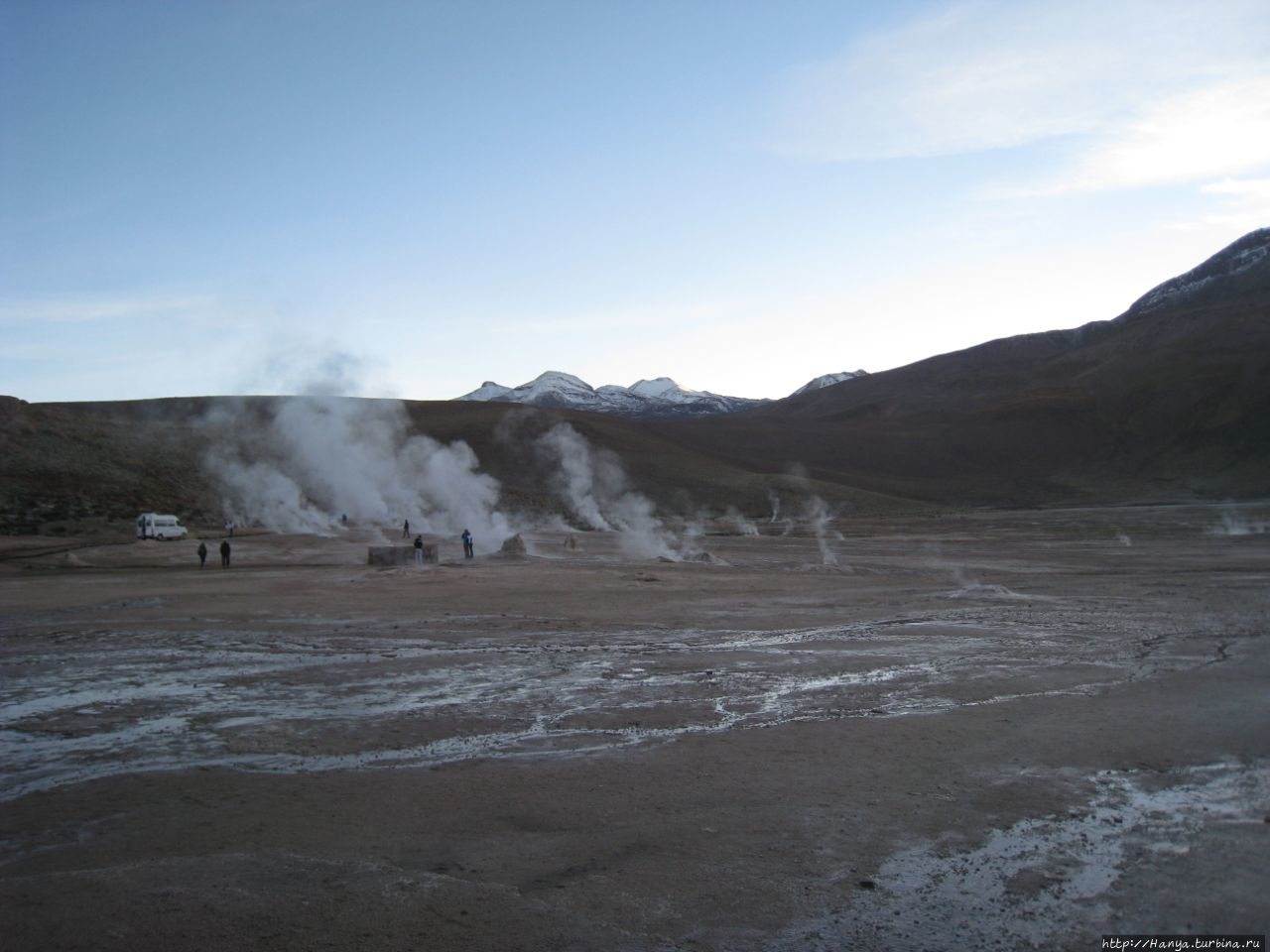 Сюрреалистические пейзажи Лагуны Чакса. Ч.45). Ранний подъем сегодня был настолько ранним (3.30), что непонятно был ли смысл спать вообще. В обозначенное время нам постучали в дверь, и мы пошли за своим lunch-box и даже успели выпить кофе с печеньем, предоставленным отелем. Оставшееся время до начала тура любовались черным звездным небом и молили бога, чтобы погода не испортилась. Еще дома нас предупредили, что перепады температур в Долине гейзеров Татио, куда сегодня по плану мы ехали, могут быть очень существенными и надо одеваться тепло. Поскольку опыта посещения геотермальных источников у нас не было, мы проигнорировали необходимость утепляться до -15 градусов, и собственно, оказались правы. Единственно, на что надо обратить внимание – это обувь, чтобы она не промокала. Группа туристов, уже сидевших в автобусе, насторожила нас – практически все были одеты в пуховики, и наши легенькие курточки вызвали у них недоумение во взглядах. Ну да ведь мы – северный народ, и нам все нипочем!Заехав за последними туристами, мы вырулили на старт самого удивительного тура в Сан Педро де Атакама. Нам предстояло преодолеть 95 км пути к северу, но экстремальная серпантинная дорога и соответствующая тряска не дала возможности поспать. Именно за этот ночной риск туристам не рекомендуется ехать к гейзерам самостоятельно, а ехать надо именно к определенному часу, так как «часы работы гейзеров» ограничены временным отрезком от 4 утра до 7.00. Именно в этот период природа распорядилась так, что мощные струи пара вырываются из отверстий, заполняя долину клубами пара, а встающее рассветное солнце добавляет красок в эту незабываемую картину, близкую по палитре к картинам Ренуара или Рериха.