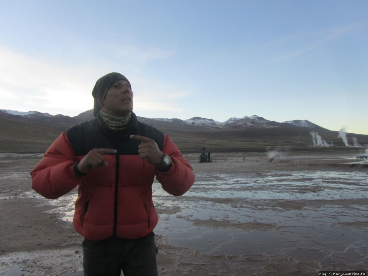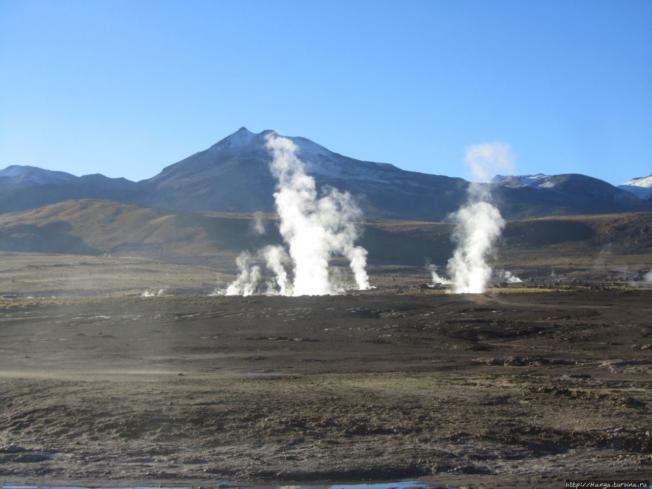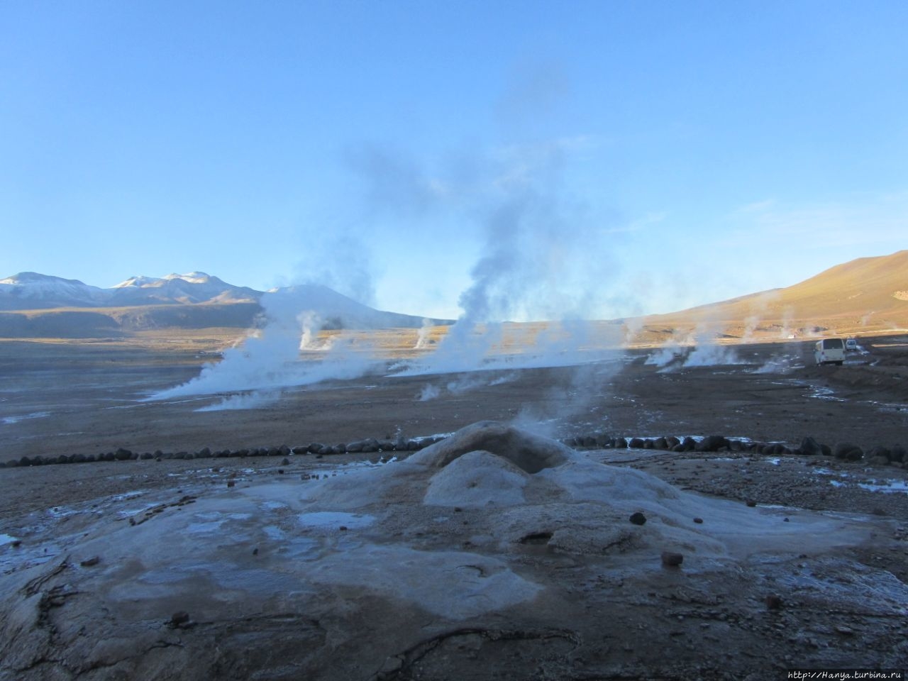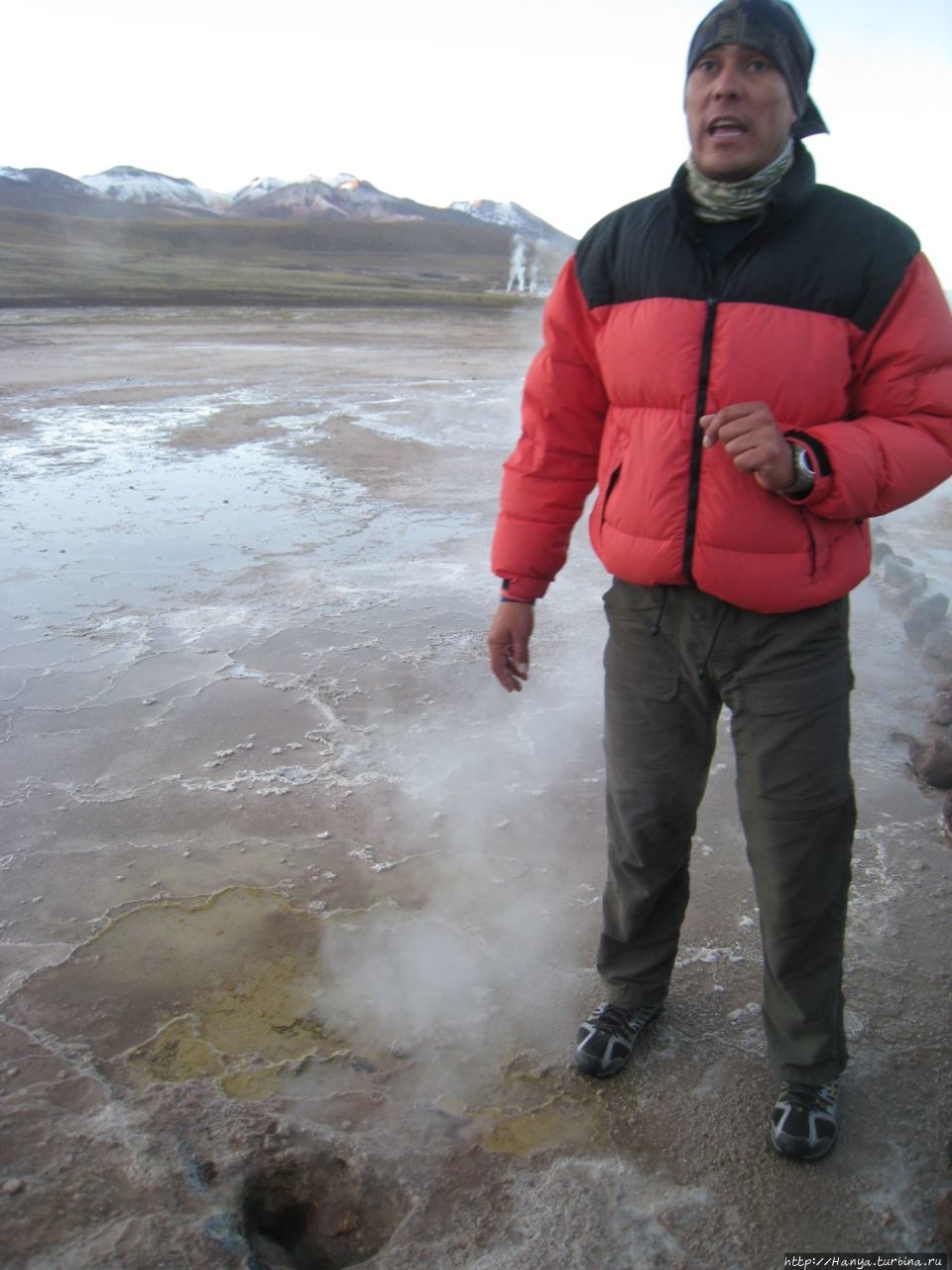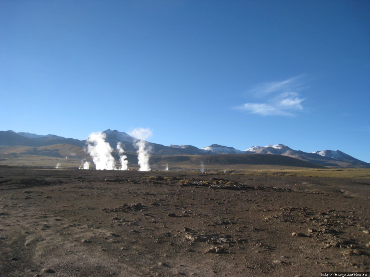 Сюрреалистические пейзажи Лагуны Чакса. Ч.45). Ранний подъем сегодня был настолько ранним (3.30), что непонятно был ли смысл спать вообще. В обозначенное время нам постучали в дверь, и мы пошли за своим lunch-box и даже успели выпить кофе с печеньем, предоставленным отелем. Оставшееся время до начала тура любовались черным звездным небом и молили бога, чтобы погода не испортилась. Еще дома нас предупредили, что перепады температур в Долине гейзеров Татио, куда сегодня по плану мы ехали, могут быть очень существенными и надо одеваться тепло. Поскольку опыта посещения геотермальных источников у нас не было, мы проигнорировали необходимость утепляться до -15 градусов, и собственно, оказались правы. Единственно, на что надо обратить внимание – это обувь, чтобы она не промокала. Группа туристов, уже сидевших в автобусе, насторожила нас – практически все были одеты в пуховики, и наши легенькие курточки вызвали у них недоумение во взглядах. Ну да ведь мы – северный народ, и нам все нипочем!Заехав за последними туристами, мы вырулили на старт самого удивительного тура в Сан Педро де Атакама. Нам предстояло преодолеть 95 км пути к северу, но экстремальная серпантинная дорога и соответствующая тряска не дала возможности поспать. Именно за этот ночной риск туристам не рекомендуется ехать к гейзерам самостоятельно, а ехать надо именно к определенному часу, так как «часы работы гейзеров» ограничены временным отрезком от 4 утра до 7.00. Именно в этот период природа распорядилась так, что мощные струи пара вырываются из отверстий, заполняя долину клубами пара, а встающее рассветное солнце добавляет красок в эту незабываемую картину, близкую по палитре к картинам Ренуара или Рериха.
