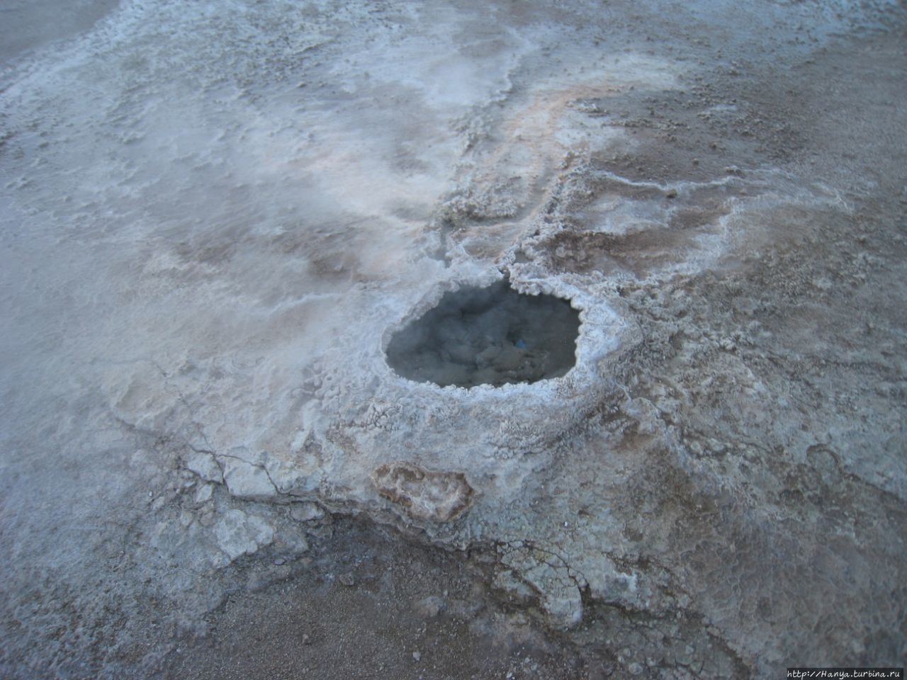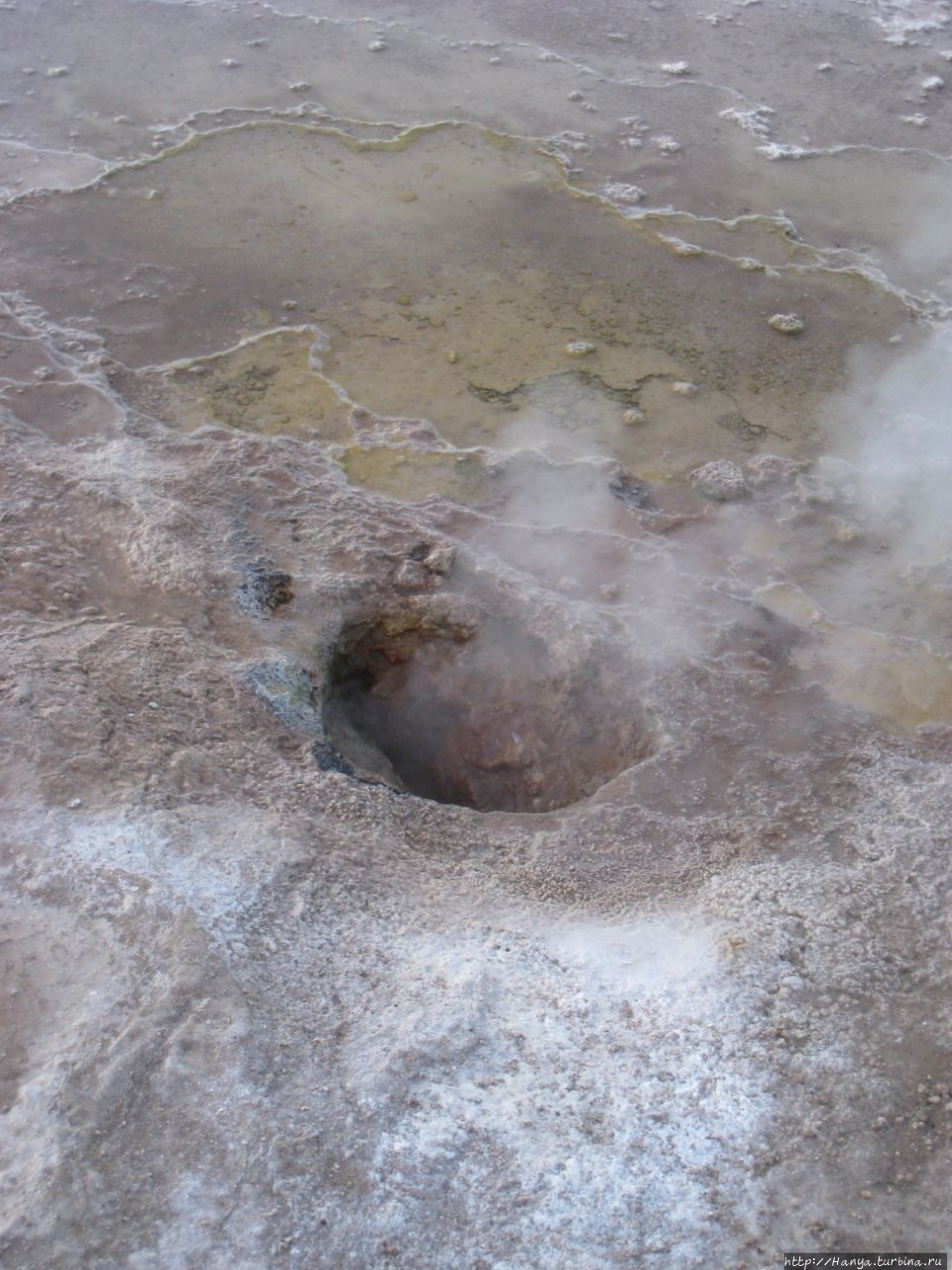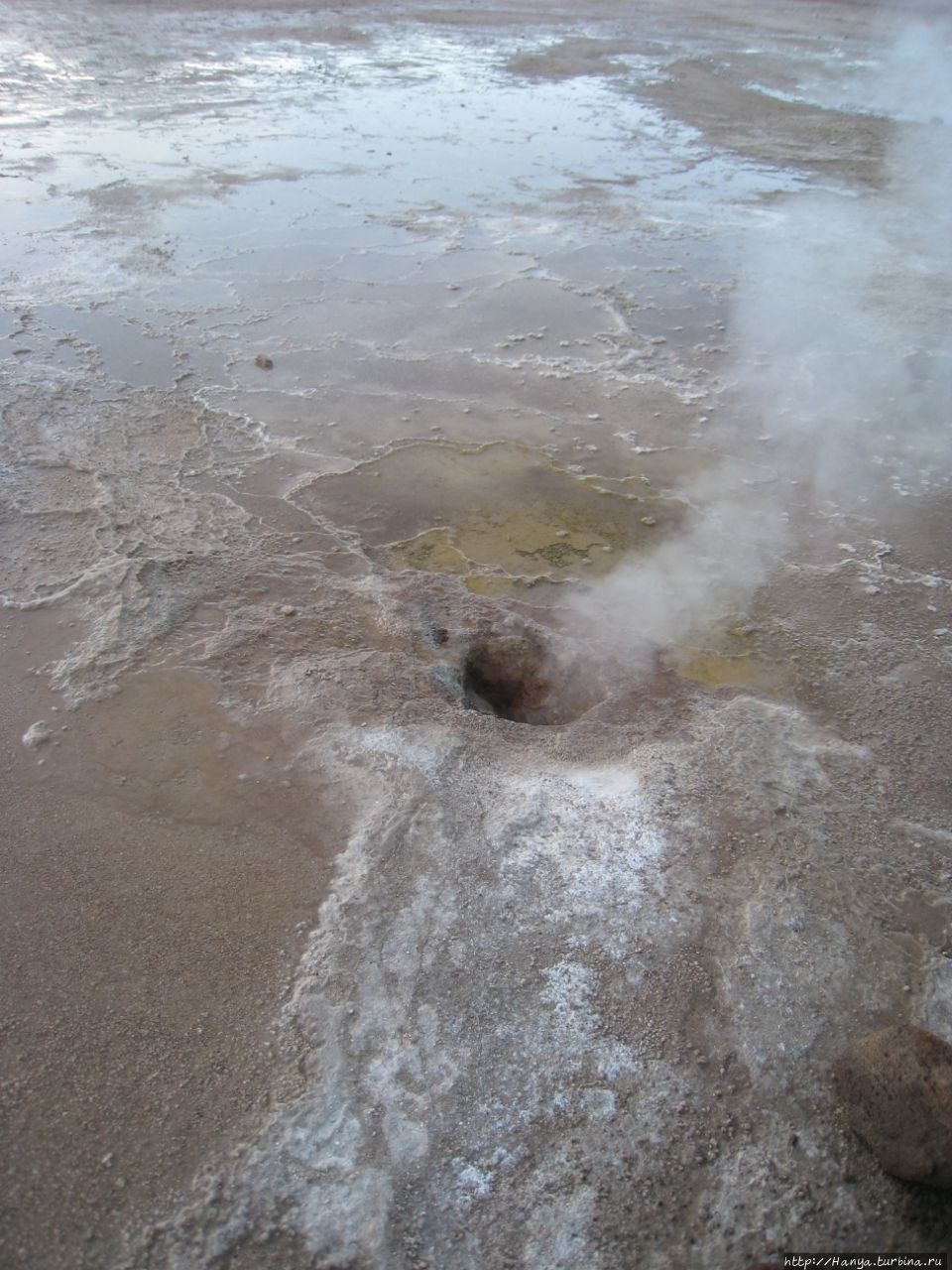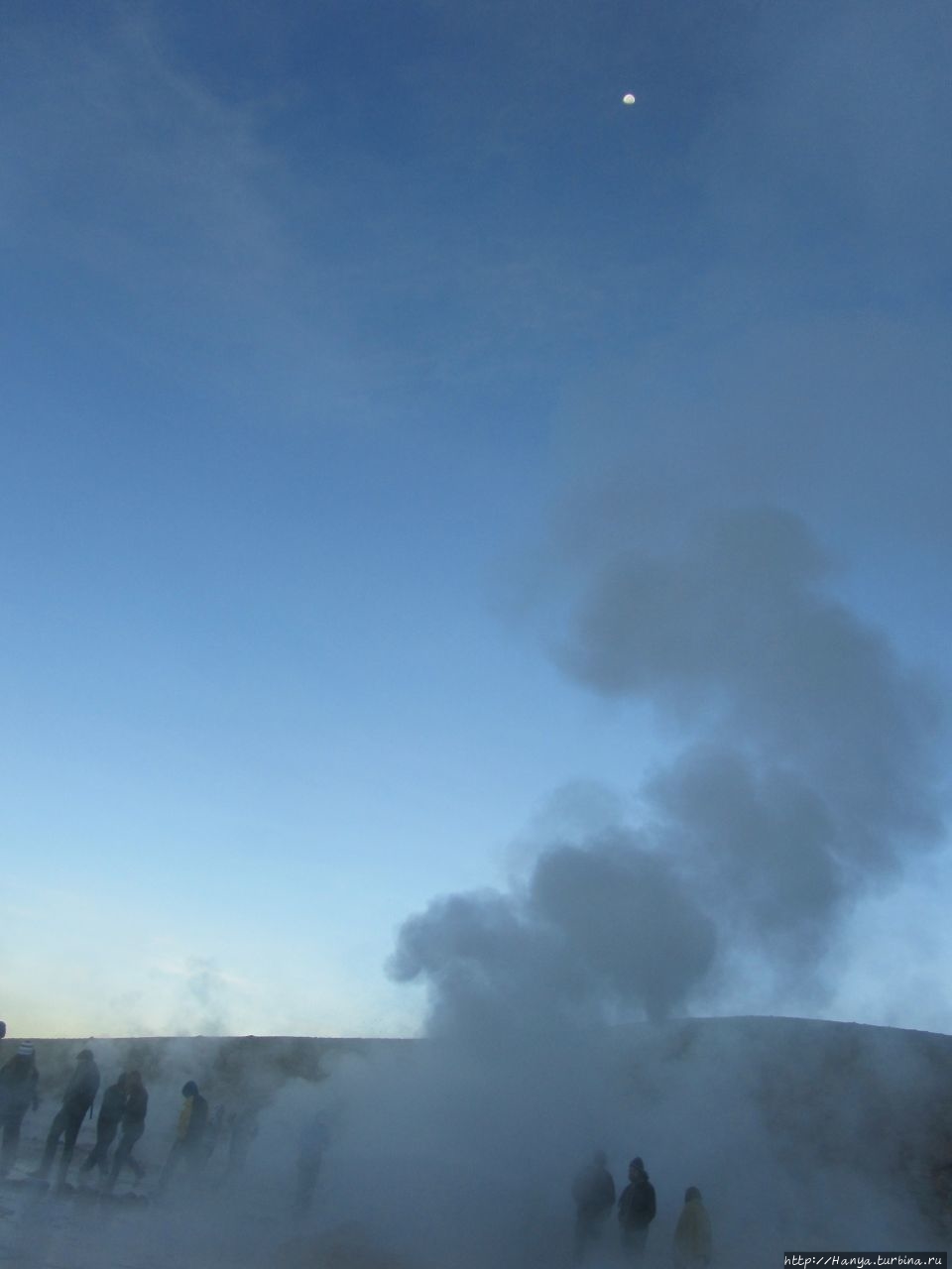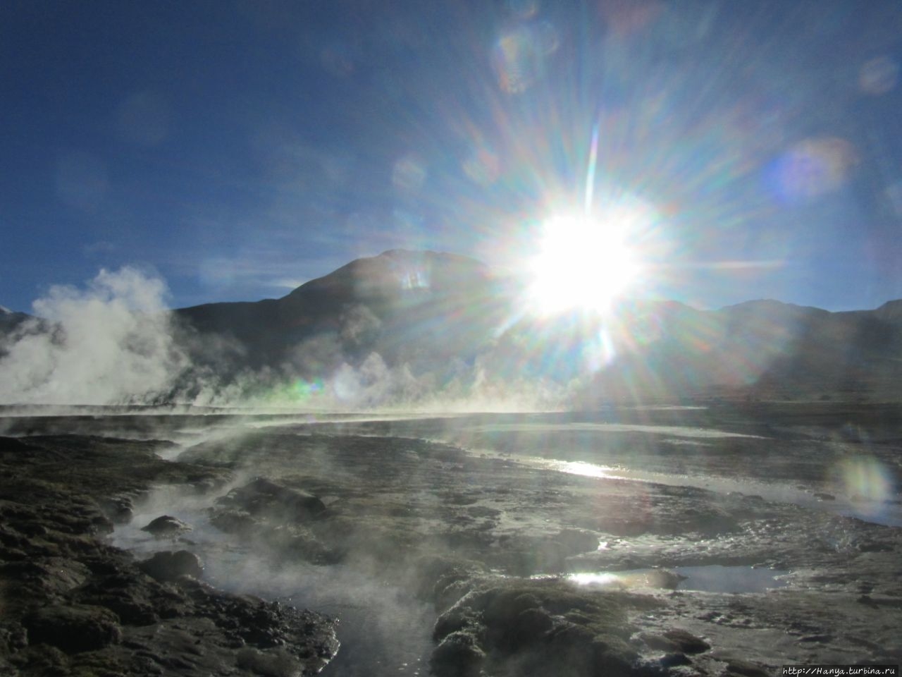 Сюрреалистические пейзажи Лагуны Чакса. Ч.45). Ранний подъем сегодня был настолько ранним (3.30), что непонятно был ли смысл спать вообще. В обозначенное время нам постучали в дверь, и мы пошли за своим lunch-box и даже успели выпить кофе с печеньем, предоставленным отелем. Оставшееся время до начала тура любовались черным звездным небом и молили бога, чтобы погода не испортилась. Еще дома нас предупредили, что перепады температур в Долине гейзеров Татио, куда сегодня по плану мы ехали, могут быть очень существенными и надо одеваться тепло. Поскольку опыта посещения геотермальных источников у нас не было, мы проигнорировали необходимость утепляться до -15 градусов, и собственно, оказались правы. Единственно, на что надо обратить внимание – это обувь, чтобы она не промокала. Группа туристов, уже сидевших в автобусе, насторожила нас – практически все были одеты в пуховики, и наши легенькие курточки вызвали у них недоумение во взглядах. Ну да ведь мы – северный народ, и нам все нипочем!Заехав за последними туристами, мы вырулили на старт самого удивительного тура в Сан Педро де Атакама. Нам предстояло преодолеть 95 км пути к северу, но экстремальная серпантинная дорога и соответствующая тряска не дала возможности поспать. Именно за этот ночной риск туристам не рекомендуется ехать к гейзерам самостоятельно, а ехать надо именно к определенному часу, так как «часы работы гейзеров» ограничены временным отрезком от 4 утра до 7.00. Именно в этот период природа распорядилась так, что мощные струи пара вырываются из отверстий, заполняя долину клубами пара, а встающее рассветное солнце добавляет красок в эту незабываемую картину, близкую по палитре к картинам Ренуара или Рериха.