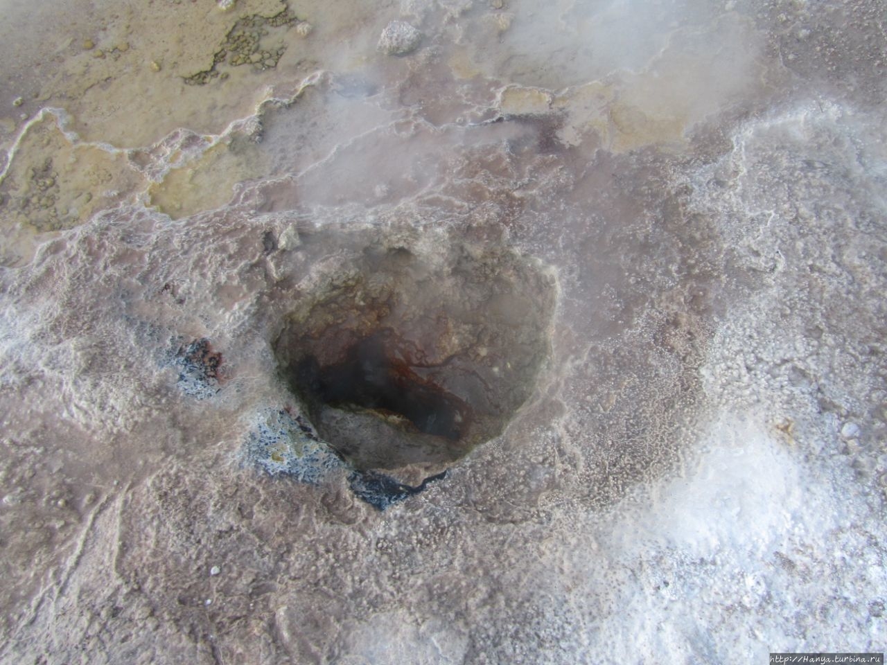 В отдельных отверстиях вода клокочет невысоким фонтаном и можно сделать фото почти рядом с этим водным вулканчиком.