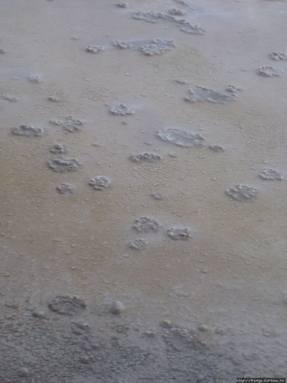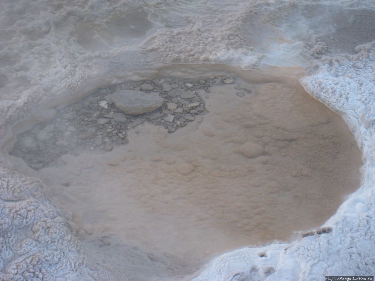 Вода в фумаролах настолько прозрачная, что виден каждый камешек, а выступившая по краям соль украшает водное блюдце по типу сервировки бокалов крошками сахара.