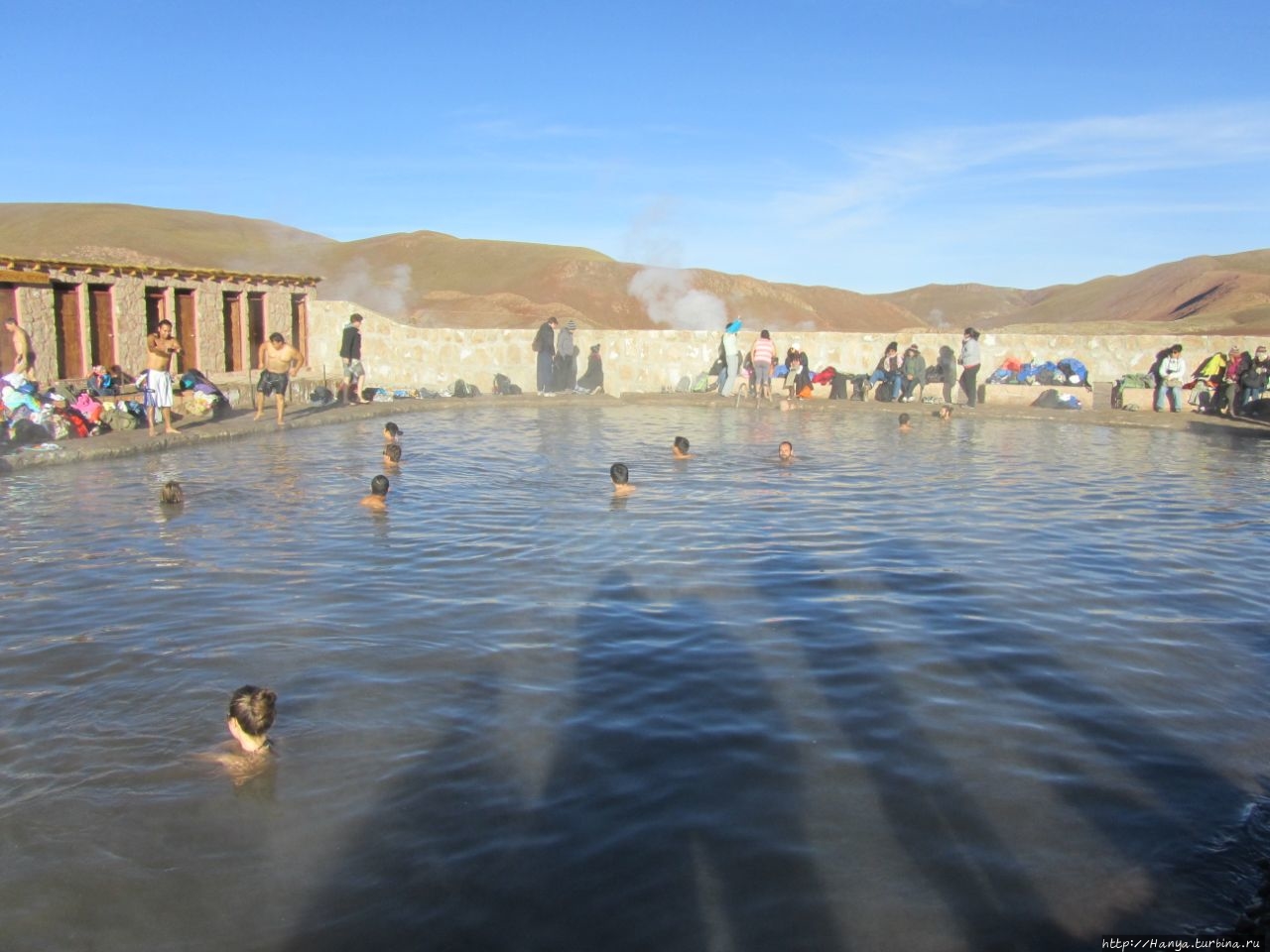 Мы сделали выбор в сторону съемок и оторвались на этом поприще по полной, так как окружающие виды были обалденными! Правда, подойдя к водной глади термального бассейна, все же сделали фотографии пловцов, тесно сбившихся в кучки – в бассейне тепло (+ 32), но держать плечи на воздухе холодновато! Купание в минеральных термальных источниках на фоне заснеженных гор – это здорово, но как выйти на +5-10? И не знаю, кого было больше – купающихся или наблюдающих за ними.