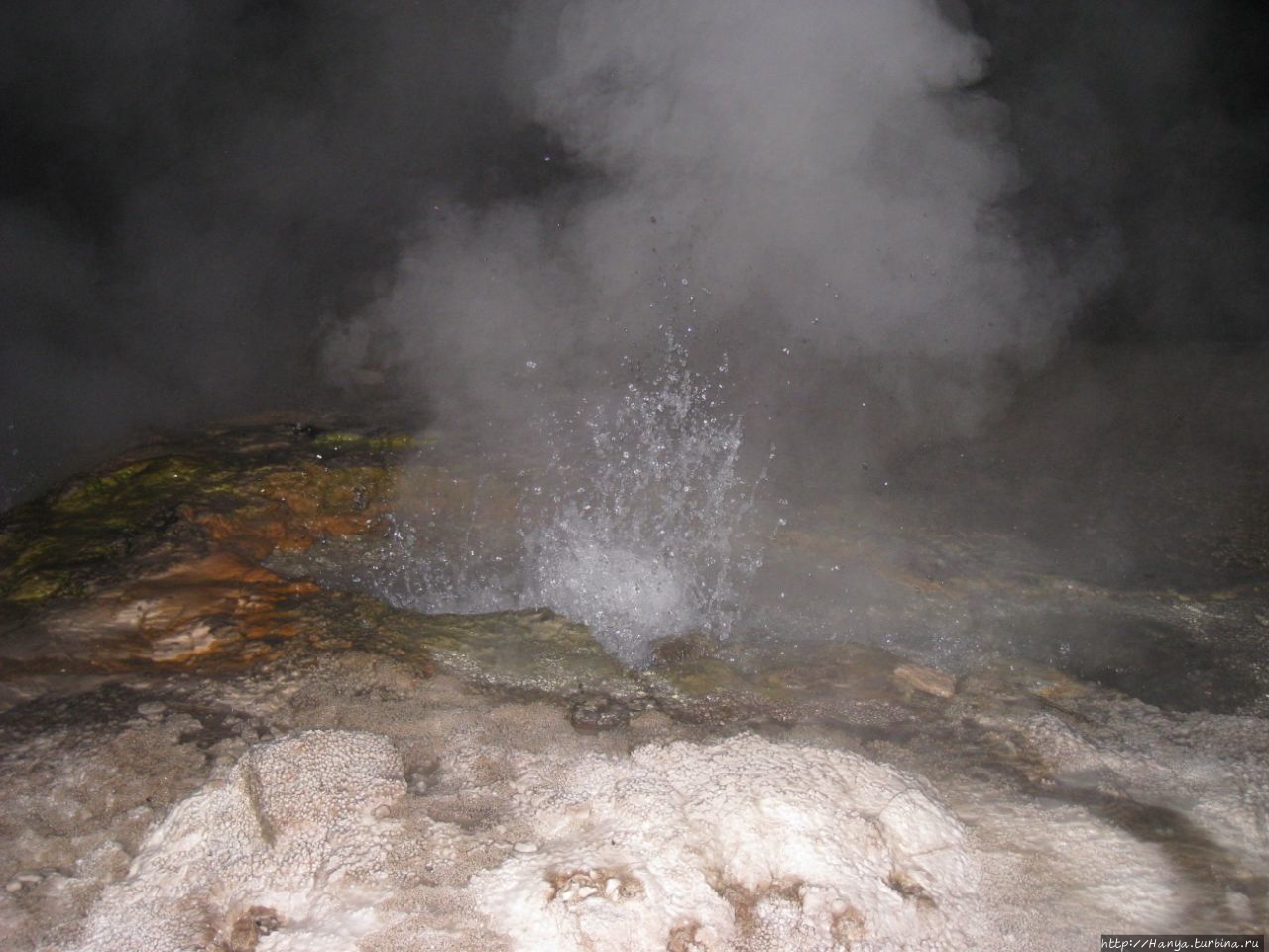 Это театральное представление, эти природные световые фонтаны можно наблюдать там, где существуют действующие вулканы. Однако природное явление объясняется подъемом горячего пара от раскаленных пород сквозь трещины. Если этот газ поступает в резервуар с водой, то нагревает последний, образуя пар, который в свою очередь ищет путь на поверхность Земли. Все это двигается по имеющимся трещинам, скапливаясь в так называемых изгибах-карманах и достигнув критического давления, взрываются водяной бомбой, выбрасывая поверхностную воду вверх. Давление в кармане снижается, «открывая клапан» для пропуска следующей порции газа и все начинается сначала. Отдельные столбы воды и пара могут достигать высоты 10 метров – такова сила извержения гейзера! Все возможные места извержения на этом высокогорном плато, как я уже говорила, ограждены камешками, в темноте их можно не увидеть, поэтому надо очень аккуратно следить за парящими благодаря разнице температур гейзерами.
