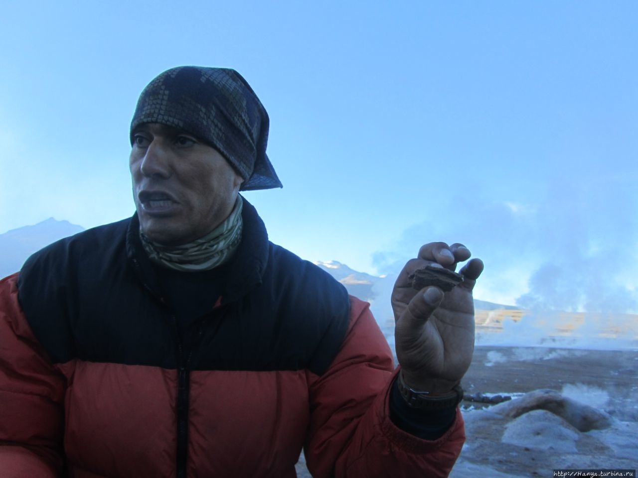 Долина гейзеров Tatio находится на высоте 4320 м и зажата между вулканами Торкопури и Сайрекабур, эта близость гор и объясняет резкий контраст температур, когда температура зимой здесь действительно может доходить ночью до – 15 градусов, а днем достигать + 30.