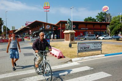 У пограничного пункта стоит памятник — испанец с велосипедом. Это памятник гастарбайтерам в Гибралтаре, на памятнике так и написано — трабахадорес чего-то там. Тут же мимо проехал еще один велосипедист, как бы доказывая, что памятник поставлен не зря.