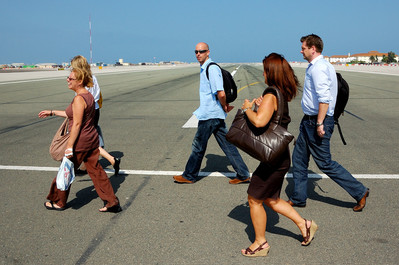 А вот дальше прикол. Дорога идет поперек взлетно-посадочной полосы аэропорта. Там стоит светофор — когда самолет взлетает или садится, проход и проезд закрывают. Но бывает это нечасто, в Гибралтар редко кто-то летает, так что большую часть времени местные жители ходят туда-сюда. Любопытное место — где еще можно сфотографировать людей у осевой линии ВПП :)