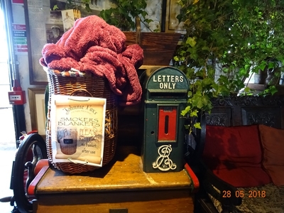 Бабуля с подносом до сих пор работает: ей поручено хранить пледы для курильщиков. Пледы лежат в плетеной корзинке с запиской, в которой их просят вернуть на место после использования. Курить под крышей паба запрещено, поэтому пледы в климате Ирландии – необходимая вещь.