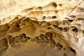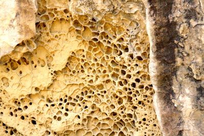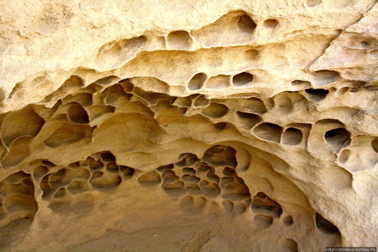Многие стены сильно пористые скорее под воздействием естественной эрозии от перепада температур и ветра. Мне трудно представить себе что такую структуру могли бы сделать к примеру летучие мыши или ласточки? Или что подобная пузырчатость могла возникнуть от излишнего перегрева под солнечными лучами ... )))