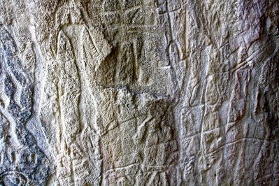 На фото выше перед изображением сцены выбит номер — 88. Все изображения таким образом пронумерованы самими же древними людьми так, чтобы инвентаризационный номер навечно остался здесь. В некоторых случаях, отмеченных особо сакральными числами вроде 66, надо лезть в темное подземелье... Так как в Гобустане водится много змей, это может оказаться приключением в стиле Индианы Джонса.