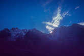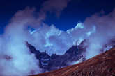 Солнце…подходит к нам минут на 15, дальше мы скрываемся в тени высокого взлёта на самый верх перевала. Глаза радуются искрящимся переливам почти млечного пути под ногами. Но выше начинается снег. Да, ведь вчера весь вечер сыпало. Каски надеты, голова вооружена осознанием того, на какой ты высоте, и что сверху может прилететь. Разбившись по темпу ходьбы на несколько групп, шаг за шагом мы приближались к вершине. Позади осталась космическая пустота, здесь на огромной косой полке, выложенной подобием каменных ступеней, уводящей зигзагами наверх, совсем другой мир. Мир полный движения, полный опасности неосторожных движений, полный подвижного снега и льда. В некоторых местах хотелось сказать спасибо этому огромному одеялу, сгладившему неровный рельеф, но в некоторых он вызывал страх. Страх ненадёжности, страх отсутствия трения, страх высоты.