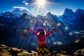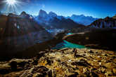 Дыхание уже привыкло к такому воздуху, привыкло к тому, что постоянно нужно идти вверх, и ты спокойно выходишь на вершину, минут за 20 до рассвета. Те, кто уже дошёл наверх выглядывают из-под флажков со встречными поздравлениями: поздравляю, мисс 5300! Потом всеобщее ликование, объятья, радостные глаза и улыбки. Люди на этой горе вообще проявляют своё счастье как-то по-особенному. То ли дело в эйфории от некоторой гипоксии, то ли правда радуются. Кто-то стоит на голове, и просит сфотографировать его с Эверестом между ног в этой стойке; кто-то делает сотни селфи; кто-то поёт песни со своим местным гидом; кто-то как я вызывает у вновь прибывших ощущение того, что эта девочка в платье тут живёт и работает аниматором, кто-то… хаос, настоящий хаос. Только спустя какое-то время, глядя вниз ты замечаешь, что тропа превратилась в настоящую транспортную магистраль. Столько народу на одной горе, в одном месте я никогда не видела. Рассматриваем одну из самых знаменитых панорам Гималаев, этот венок из каменных цветов, венчающий голову нашей земли…Места, откуда мы пришли, и перевал, через который ещё придётся идти. Ух! Внушительно. Горы, Время летит незаметно, а после обеда у нас переход через огромный ледник Нгозумба в местечко Дрогнак, откуда предстоит выход на перевал Чо Ла.