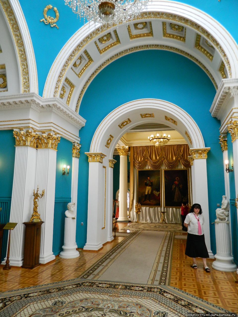 Зал двухэтажный, он был центром парадной жизни дворца. Сам дворец переходил по наследству от Румянцева к Румянцеву, пока в начале 19 века его не купил другой русский полководец Паскевич.