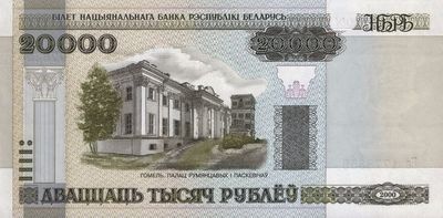 Денежные знаки в Беларуси менялись часто. Последняя деноминация обрезала 4 нуля у банкнот и белорусские деньги стали более... европейскими что ли. Многим известно народное название валюты — "зайчики" из-за зайца, который после выхода белорусского рубля в обращение, был изображён на купюре в 1 рубль. На других купюрах изображались другие животные. Позже, в 2000 году были выпущены новые дензнаки, на купюрах которых уже изображались архитектурные памятники. На купюре в 20 000 белорусских рублей располагался гомельский дворец Румянцевых-Паскевичей.