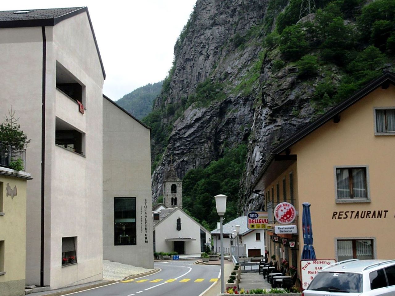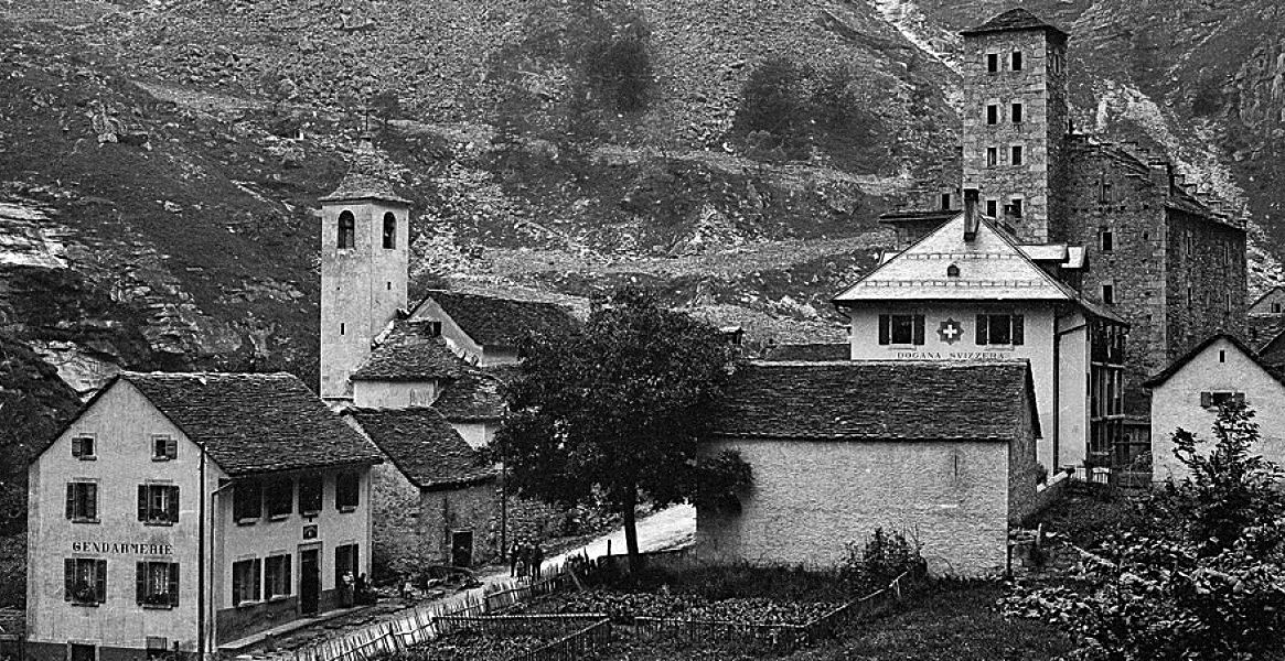 Деревню?! Вообще-то мой русский язык с трудом поворачивается называть деревней населенный пункт, в котором имеются все признаки города: каменные дома (многие из них многоэтажные), асфальтированные дороги, установлены памятники, есть церковь, рестораны, таможня, пункт обмена валют и наконец доминанта «деревни» — восьмиэтажная башня отеля «Stockalperturm». И как нам сообщает википедия, здание это – памятник архитектуры 17 века. Не знаю, есть ли здесь такой обязательный атрибут города, как тюрьма, но жандармерия есть, по крайней мере была, на старой фотографии просматривается надпись Gendarmerie.