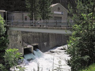 Тут же на границе, буквально на нейтральной полосе разместилась гидроэлектростанция (Wasserkraftwerk Gondo), и судя по немецкому языку на вывеске, принадлежит она Швейцарии.