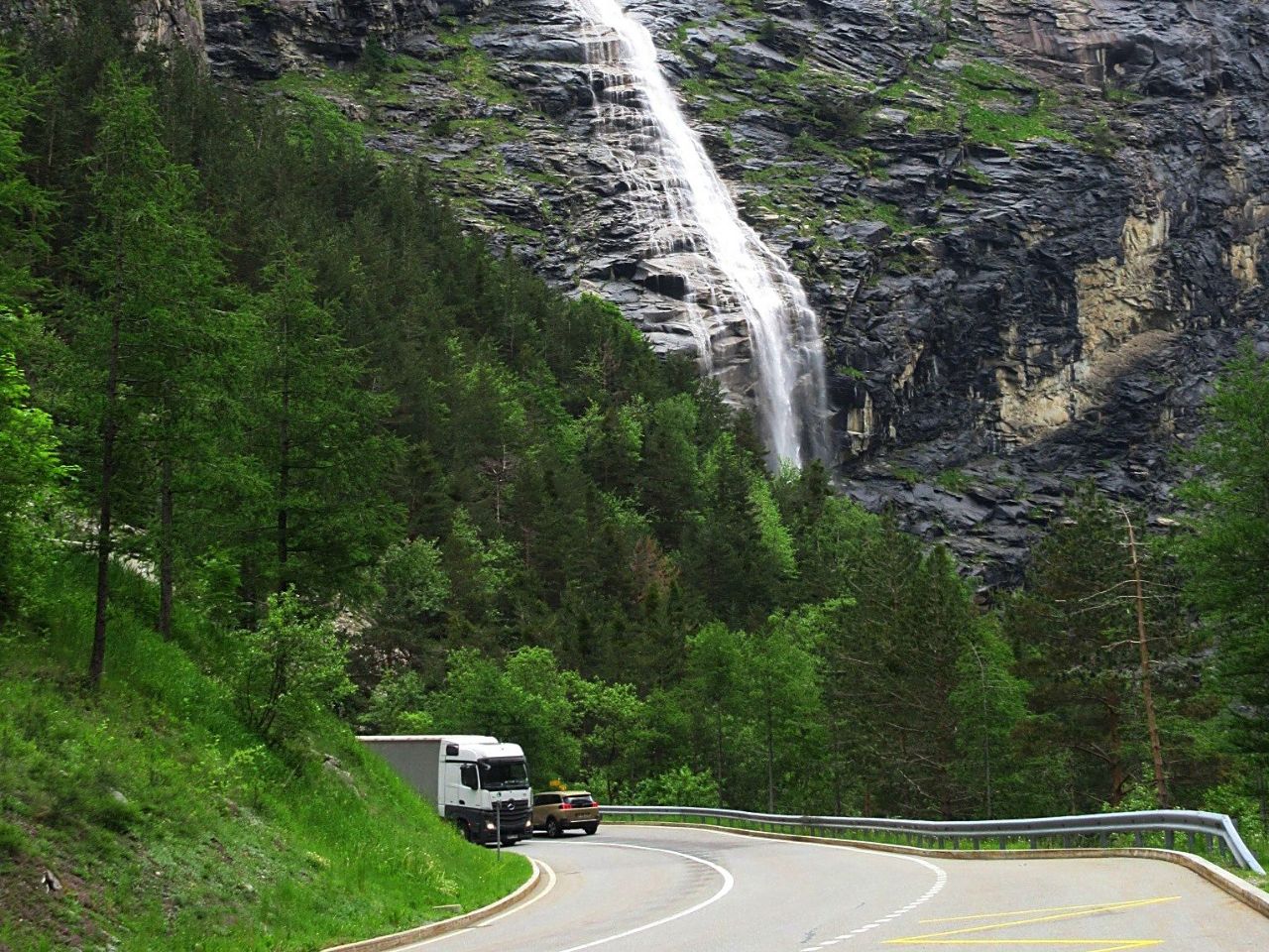 И вытекает эта Большая Вода как раз из того водохранилища, что питает водой местную гидроэлектростанцию, о которой было написано выше. Справа от водопада дорога уходила круто вверх, и там наверху я углядел мостик, из-под которого бил мощный поток. Взяло любопытство — надо ехать и рассмотреть ближе! Узкая дорога сразу закрутилась серпантином, периодически открывая виды на Доверию и Гондо под скалой.