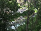 И вытекает эта Большая Вода как раз из того водохранилища, что питает водой местную гидроэлектростанцию, о которой было написано выше. Справа от водопада дорога уходила круто вверх, и там наверху я углядел мостик, из-под которого бил мощный поток. Взяло любопытство — надо ехать и рассмотреть ближе! Узкая дорога сразу закрутилась серпантином, периодически открывая виды на Доверию и Гондо под скалой.