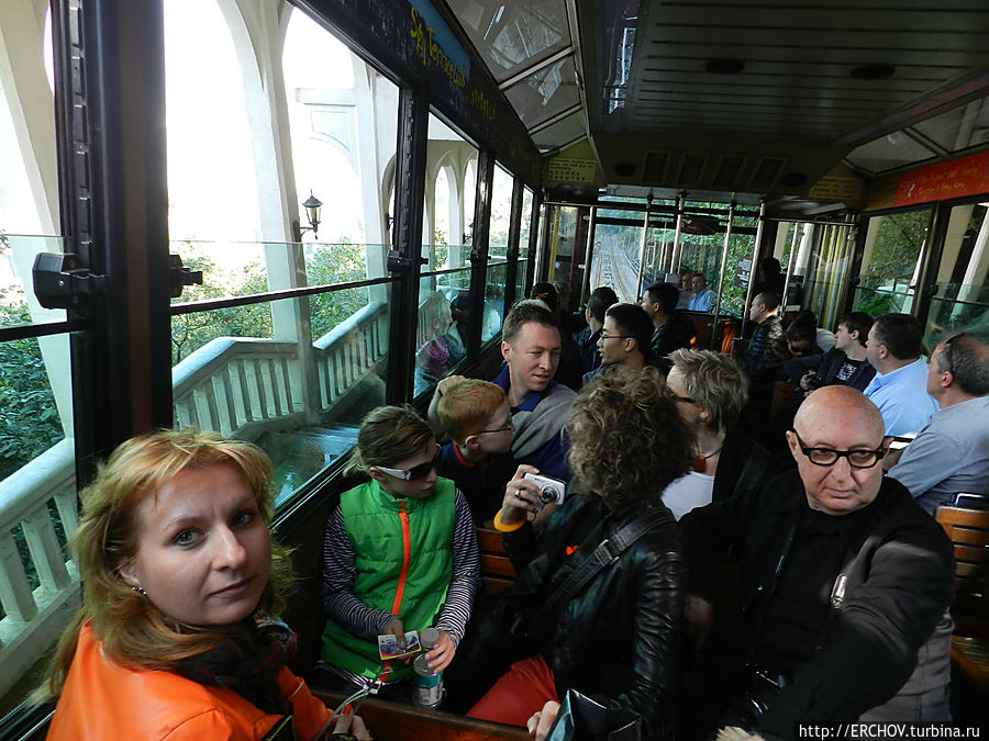 На нижней трамвайной остановке небольшой музей этого самого трамвайчика. Бегло смотрим на старинные детали и механизмы, но осмотр прерывает спустившийся вниз трамвай. Заходим в вагон, и садимся на старые деревянные скамейки. Вагоновожатый сигналит об окончании посадки, закрывает двери, и мы, упёршись в спинку, движемся вверх на гору под углом 45 градусов. Никакого страха нет – надёжность техники чувствуется даже через 125 лет.