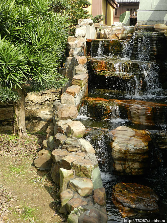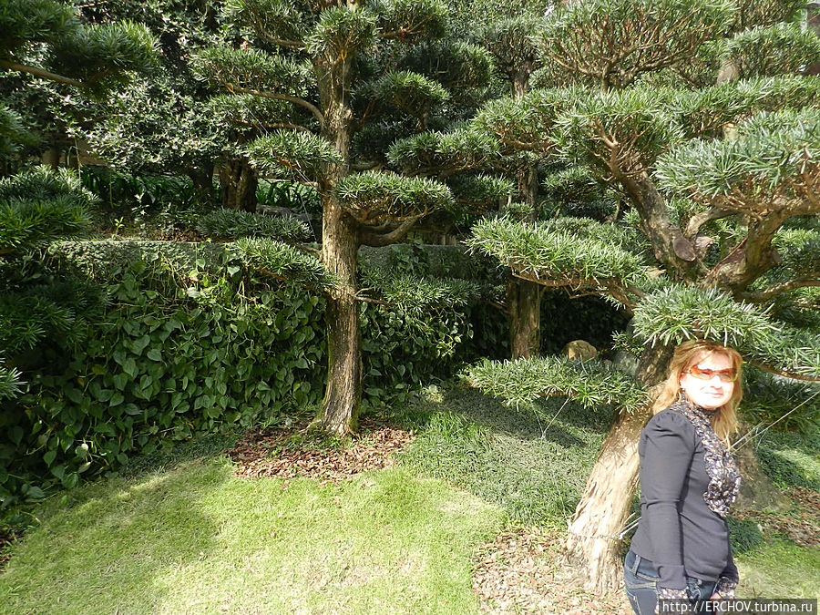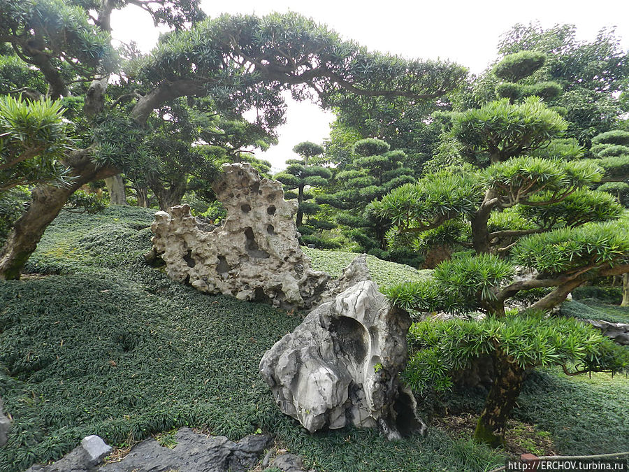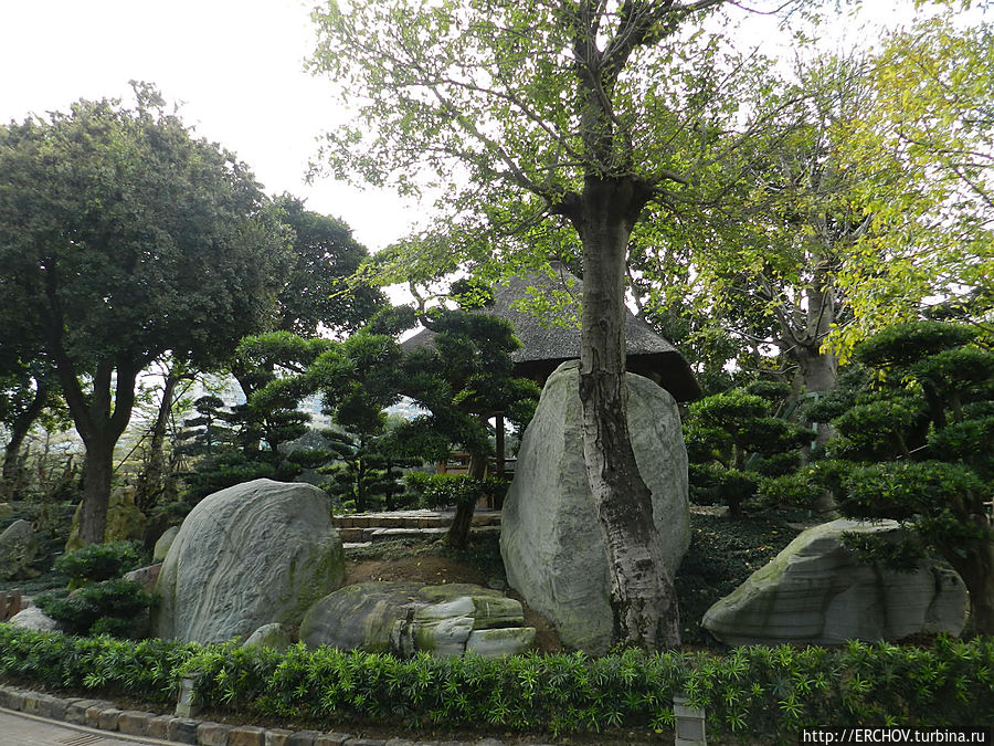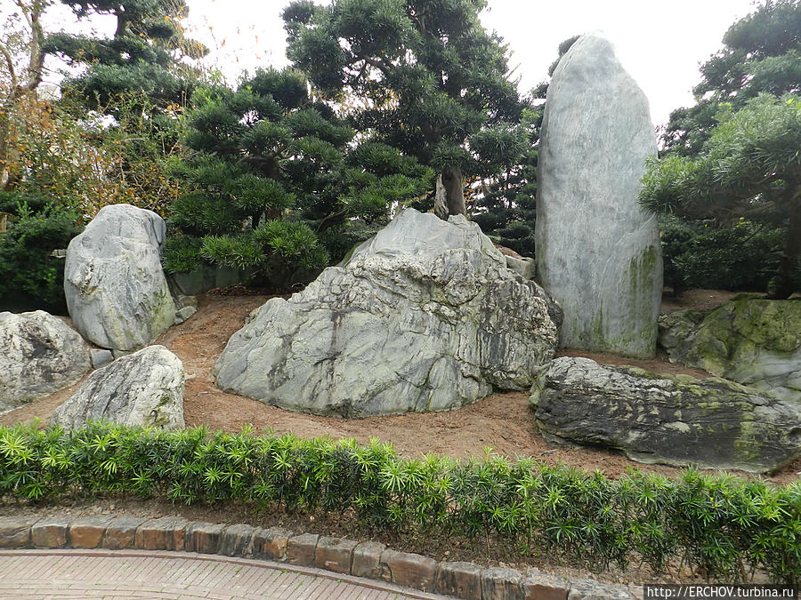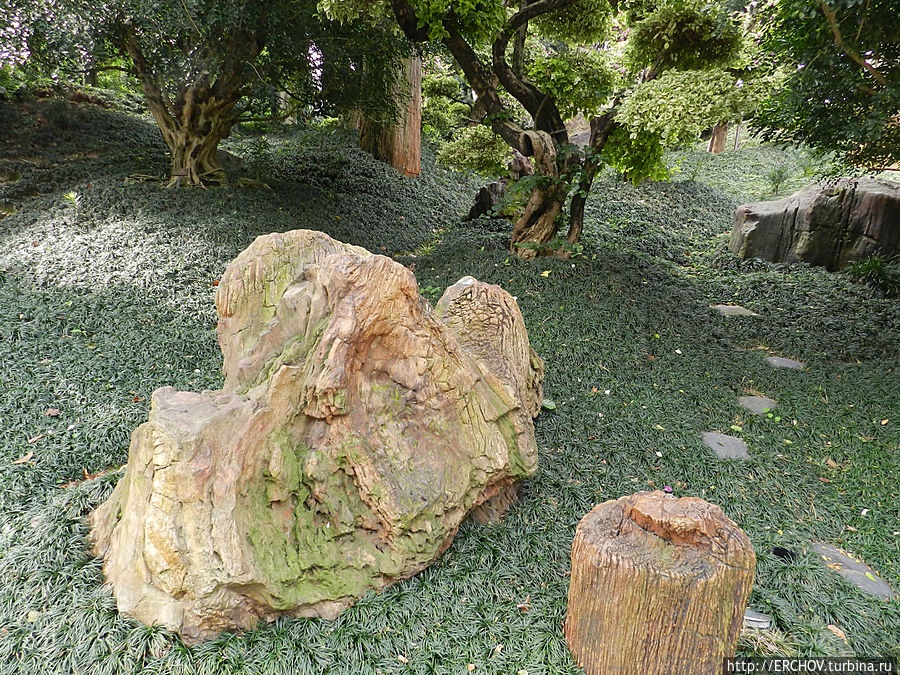 Парк разбит на этом месте искусственно, раньше его не было, и работа проделана большая – запружены пруды, привезены валуны странной формы, окаменелые деревья. Вокруг посажено множество мохнатых кустов и зелёных елей, хвойные иголочки заботливо причёсаны, пушистая травка прикреплена к камням. Конечно, парк не отдаёт девственной красотой, он скорее напоминает холёную женщину, вышедшую из парикмахерской, но в любом случае здесь красиво. На территории есть кафешки и сувенирный магазин, но особенно удивил некий павильон, где собраны камни и расставлены по каким-то особым правилам.